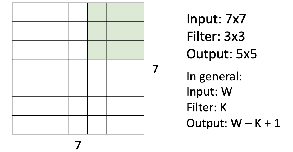 input 이미지(W)의 크기는 7x7, 필터(K)의 크기는 3x3으로 보고, 이미지와 내적을 하면서 필터를 한 칸씩 이동시킬 수 있습니다. 한 칸씩 이동을 하면서, output의 사이즈는 W-K+1로 자동적으로 결정됩니다.