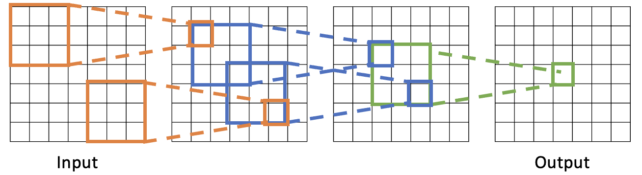 레이어가 깊어질수록 Receptive Field의 크기는 증가하고, 더 많은 입력 정보에 접근할 수 있게 됩니다. Receptive Field는 각 레이어를 거치면서 점점 넓어지기 때문에 여러 레이어를 지나면서 더 넓은 영역의 입력 데이터를 볼 수 있게 됩니다.
