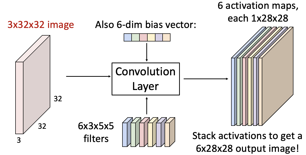 또 다른 필터로 같은 일을 반복하면 새로운 1x28x28 크기의 Activation Map이 생성됩니다. 즉, filter는 여러 개일 수 있습니다.input 이미지가 3x32x32이고, 필터의 크기가 3x5x5로 총 6개이므로 6x3x5x5입니다.
