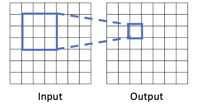 3x3 필터를 먹이면, 다음 레이어의 한 칸에 대응됩니다. 이때 이 한 칸을 생성하기 위해서, 필터가 적용된 영역을 receptive field라고 합니다.