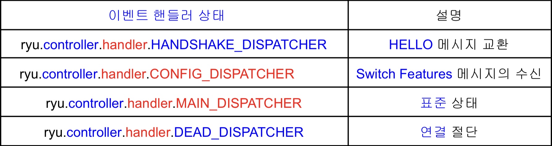 - 이벤트 핸들러는 ryu.controller.handler 다음에 핸들러 상태가 나오고, 이벤트는 ryu.controller.ofp_event 다음에 OpenFlow 메시지가 나옴