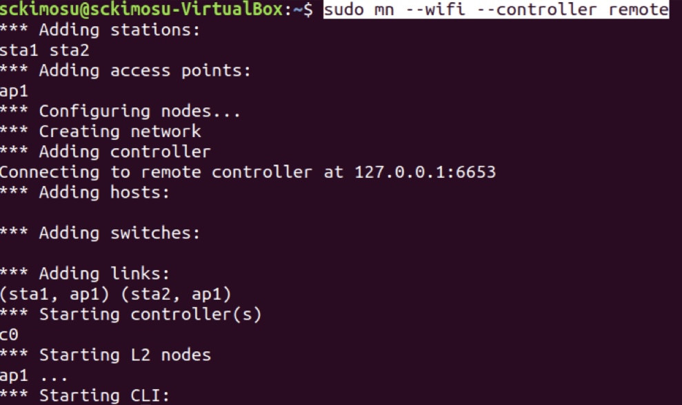 다른 터미널을 열어 네트워크를 구성함: sudo mn --wifi --controller remote