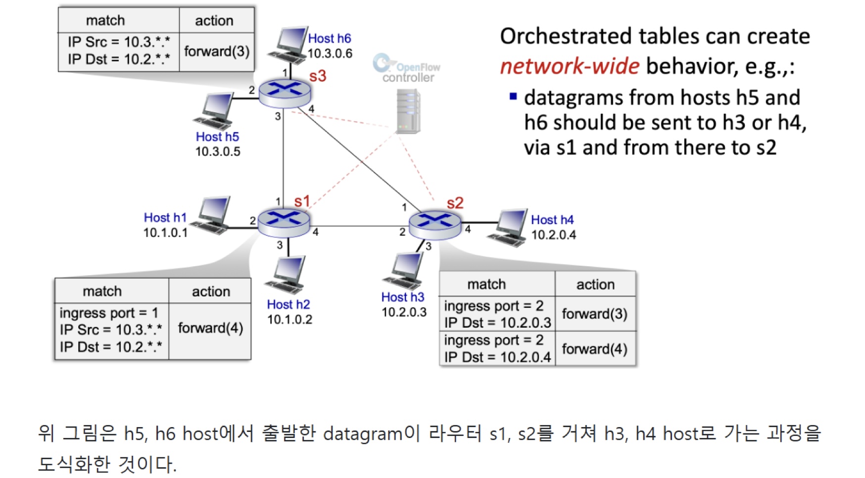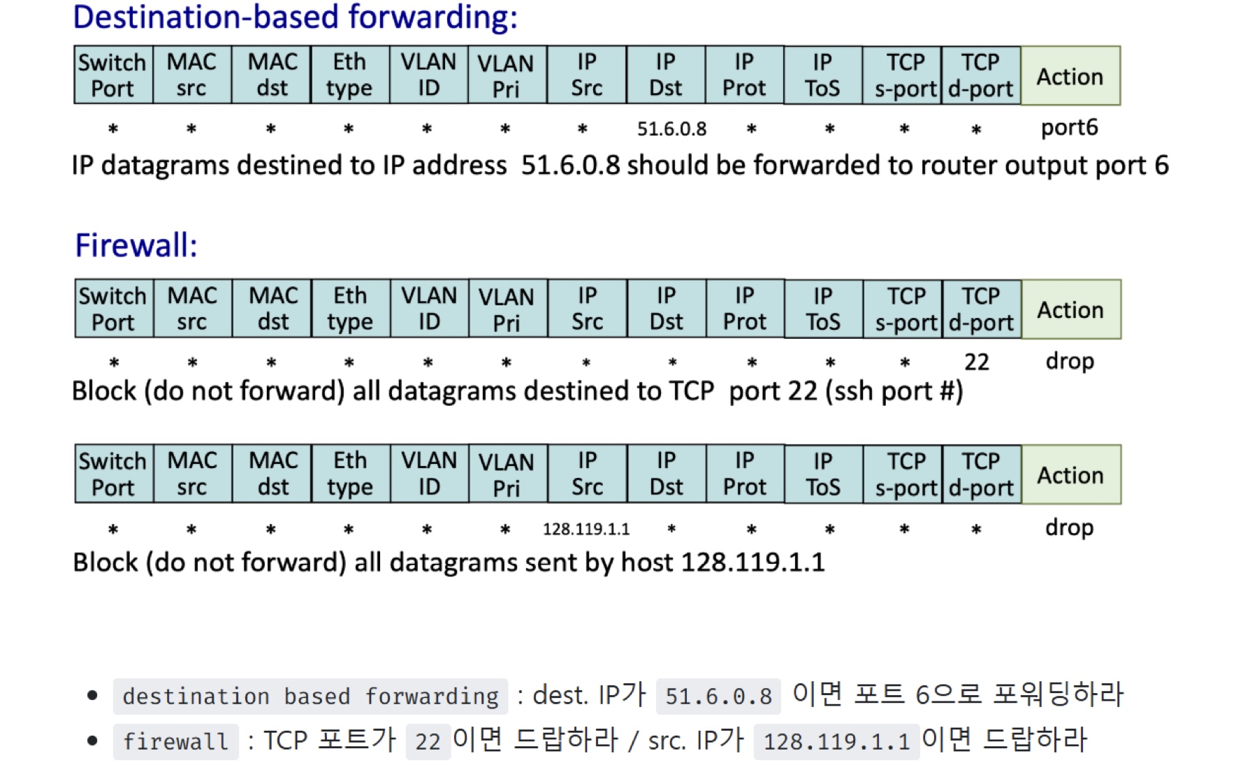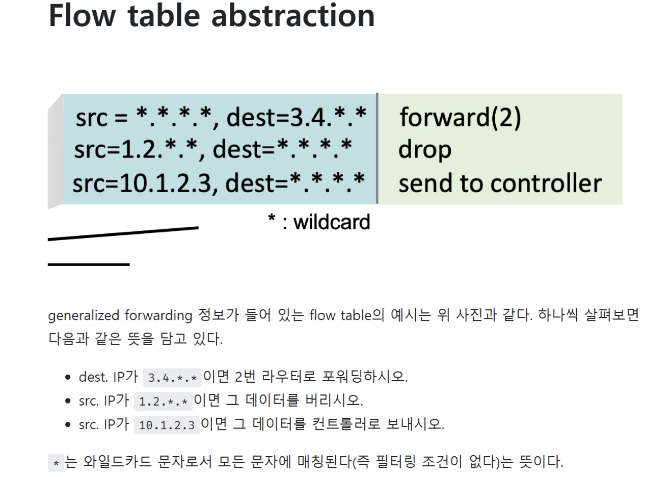 이것을 확장시킨 개념인 generalized forwarding은 destination IP address 뿐만 아니라 헤더에 있는 다른 다양한 필드들을 가지고 다양한 작업을 수행할 수 있는 메커니즘을 의미한다.