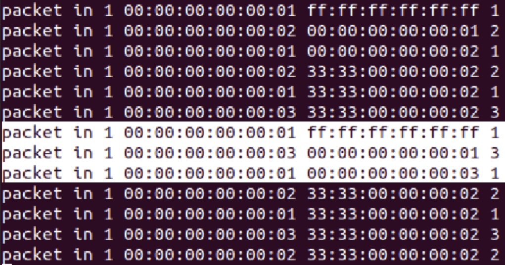 첫 번째 Packet-In은 호스트 1이 발행한 ARP request이고, 브로드캐스트이므로 플로우 항목에 등록되지 않고 Packet-Out만 발행됩니다.
