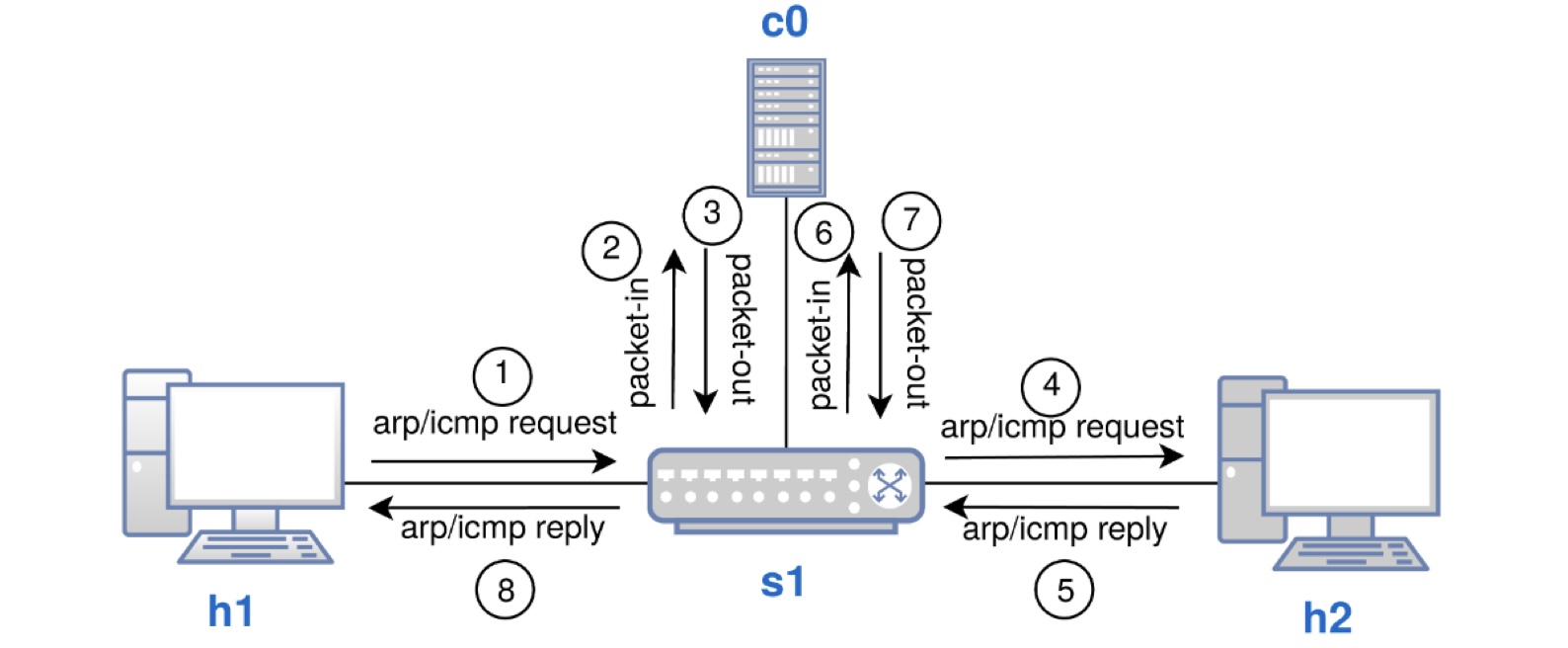 - Open Switch s1은 h2의 존재를 알지 못하고, Ping Request 메시지를 Open Controller c0에 전달합니다.