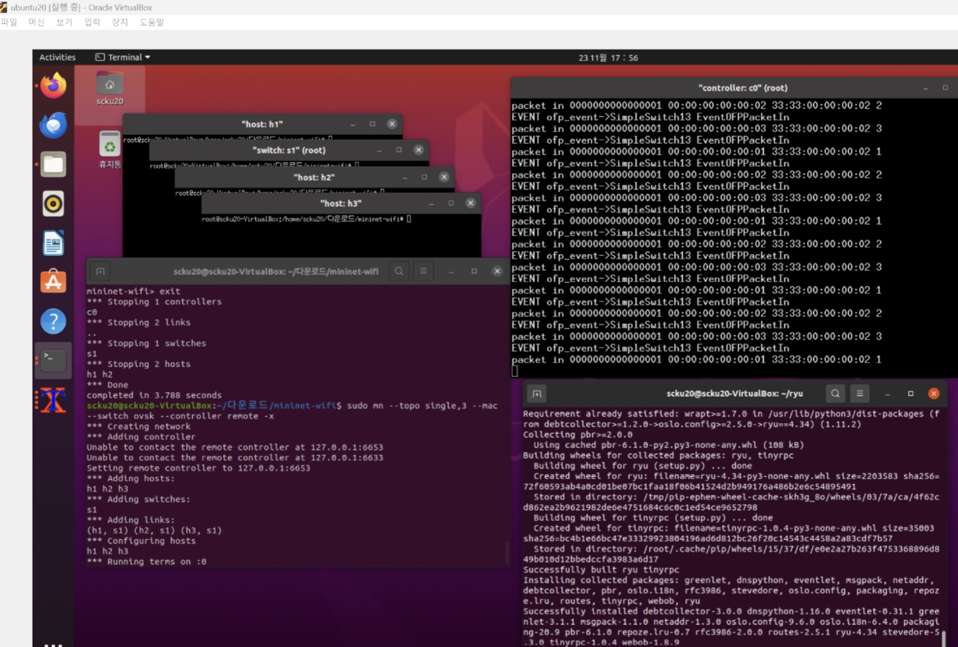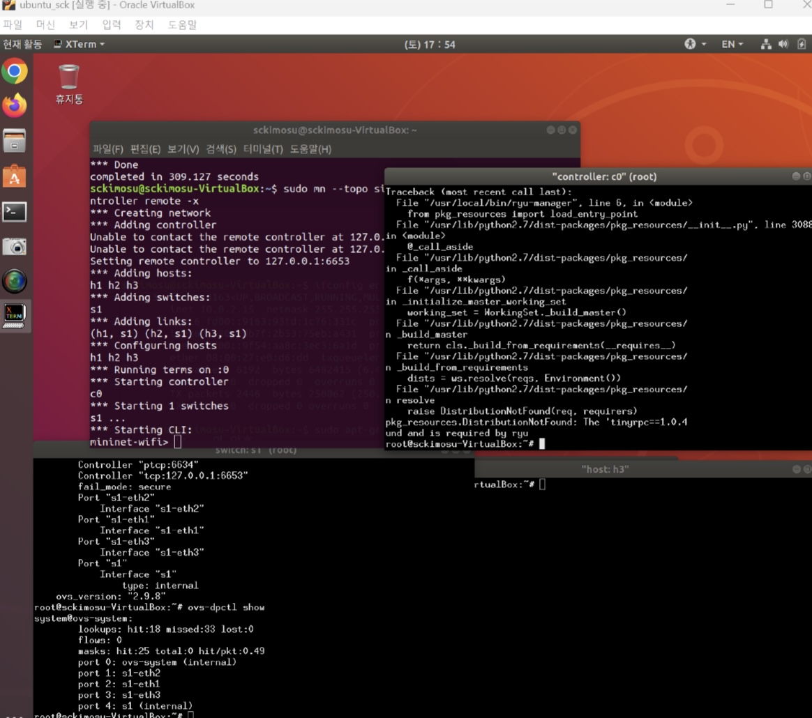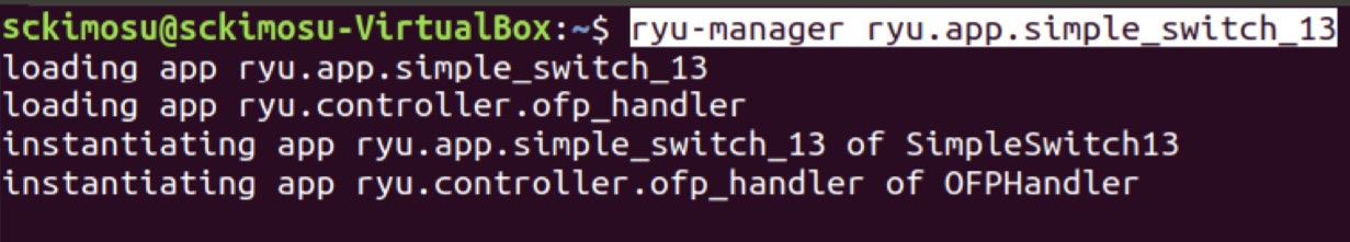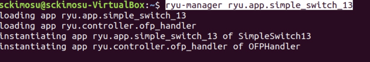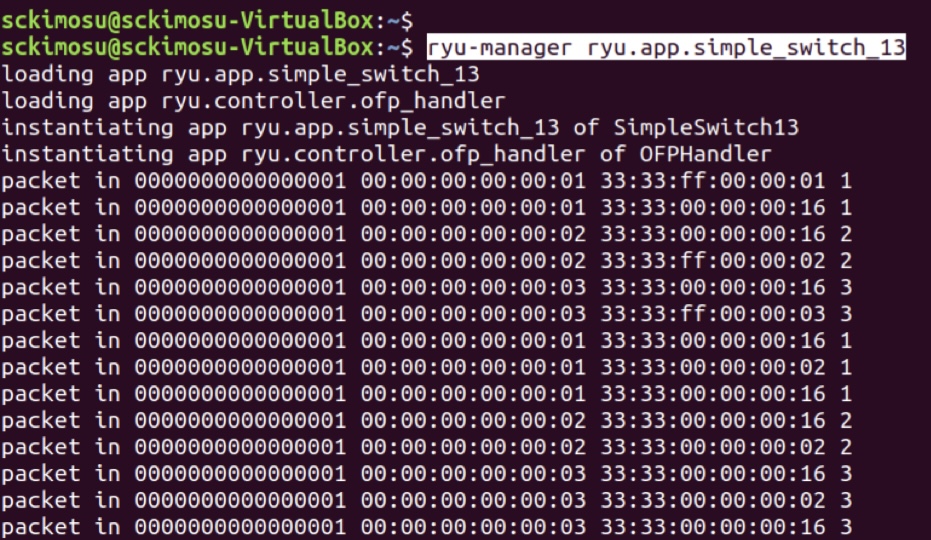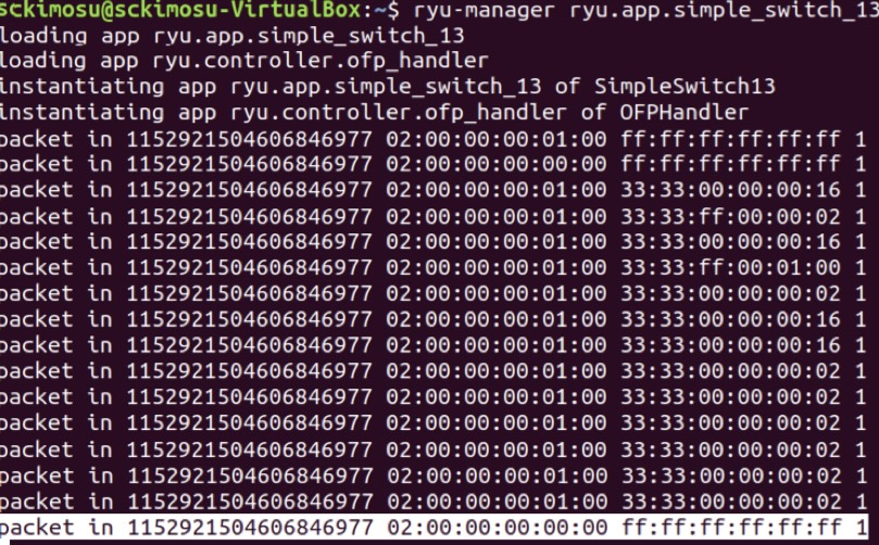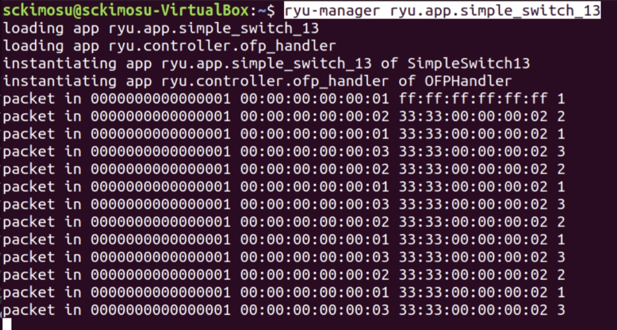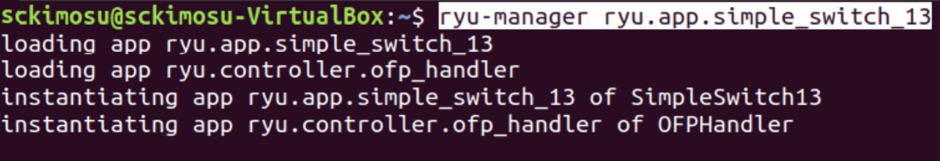 터미널을 열어 ryu 컨트롤러 실행해서 대기시킴: ryu-manager ryu.app.simple_switch_13