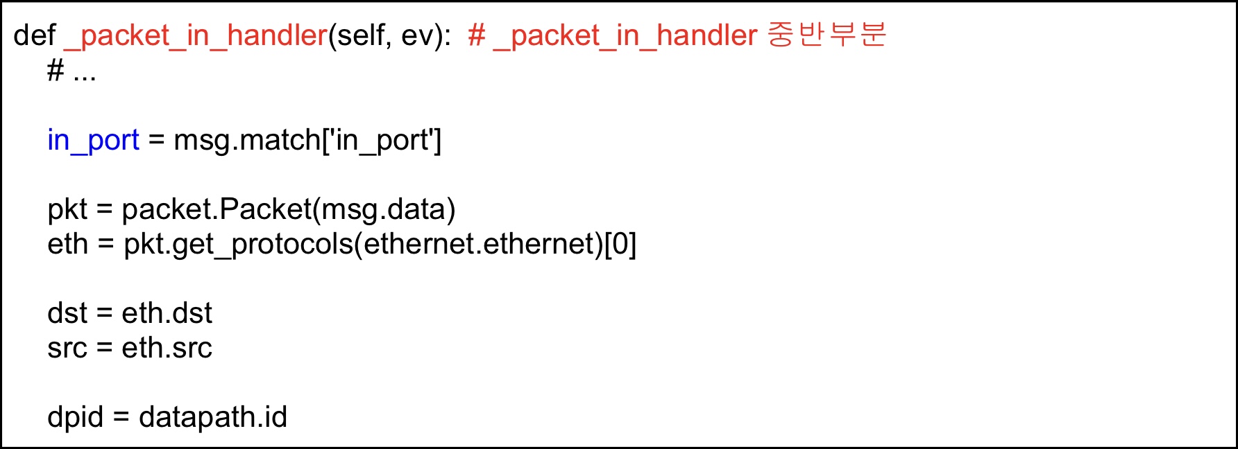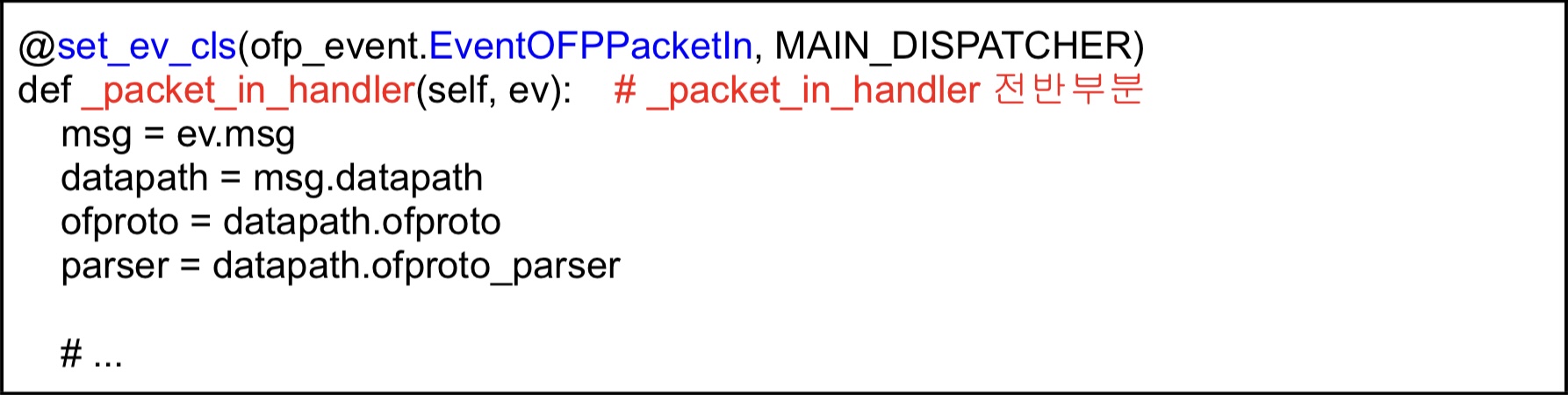 - Ryu 응용 프로그램으로 구현하기 위해 ryu.base.app_manager.RyuApp을 상속함.