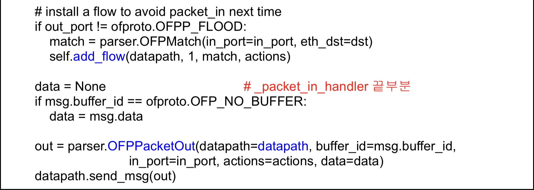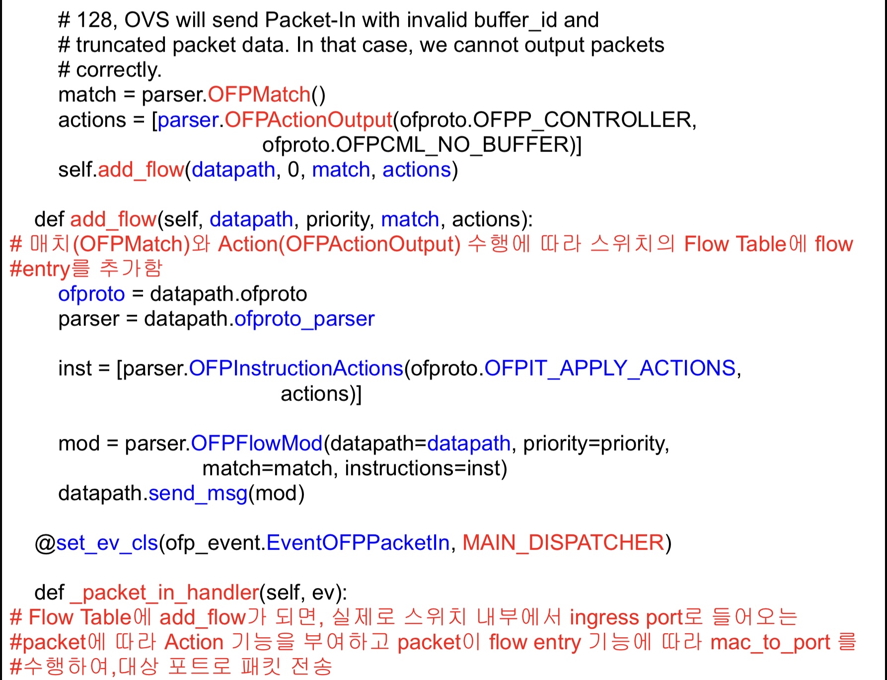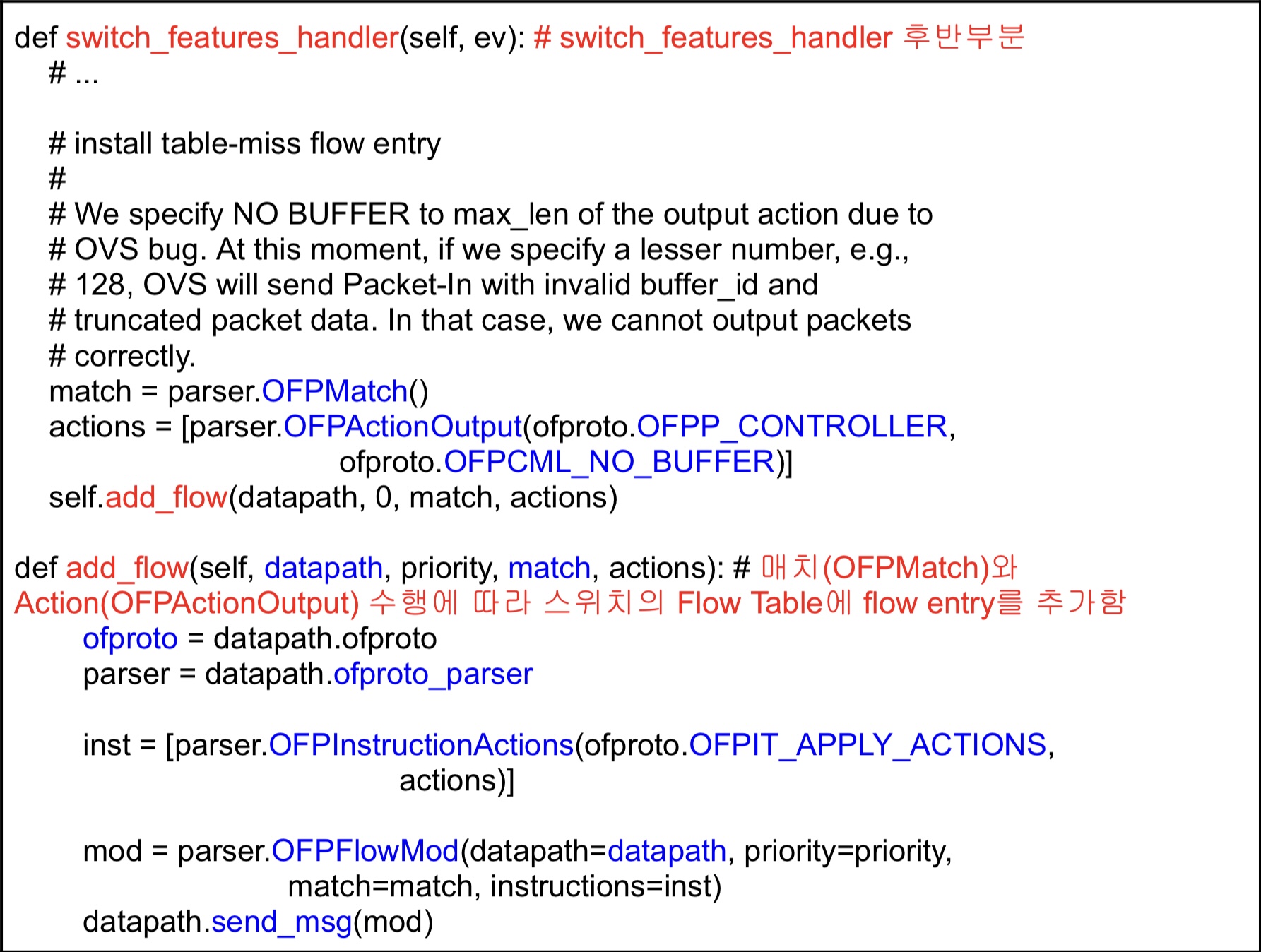 - 컨트롤러가 OpenFlow 스위치와의 핸드 셰이크 완료 후에 수행하는 함수로, 스위치를 제어하는 역할인 Flow Table을 수정하는 add_flow () 함수가 속해 있다