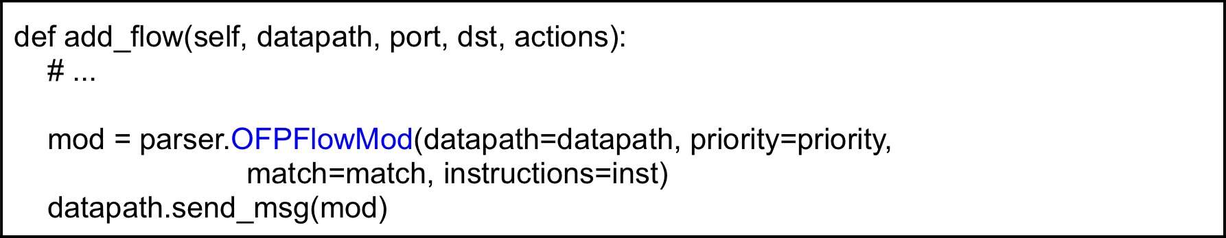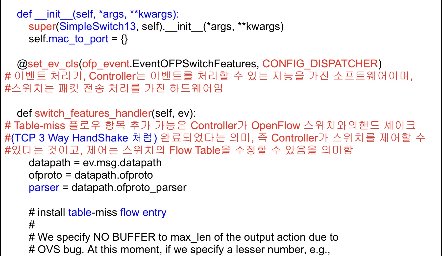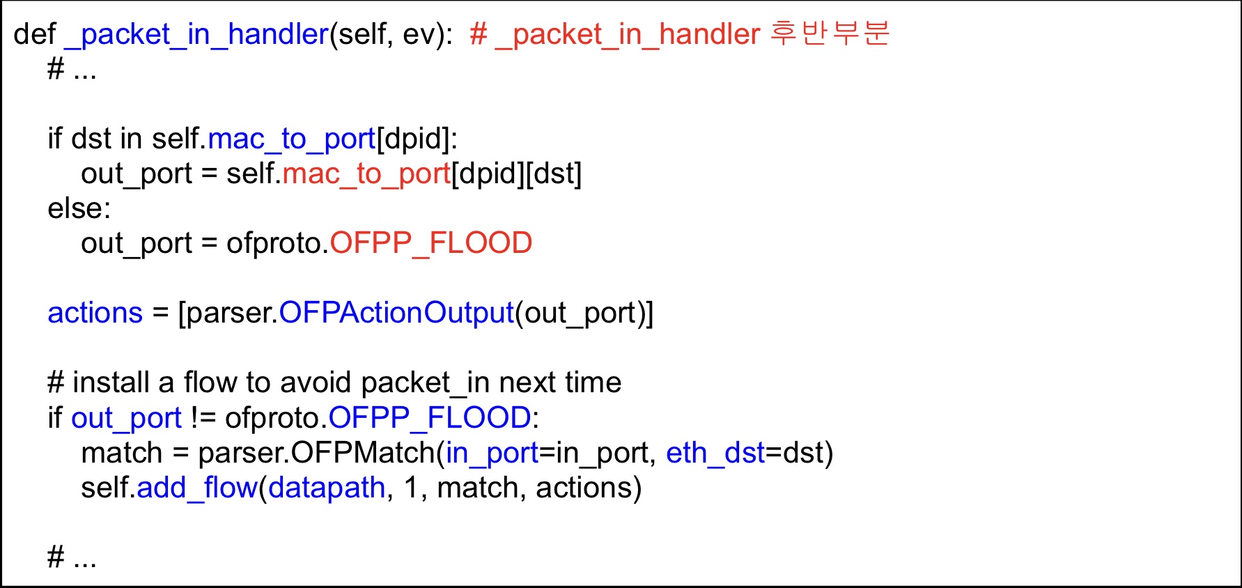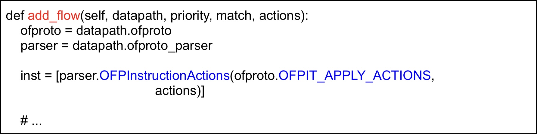 - 컨트롤러가 OpenFlow 스위치와의 핸드 셰이크 완료 후에 수행하는 함수로, 스위치를 제어하는 역할인 Flow Table을 수정하는 add_flow () 함수가 속해 있다