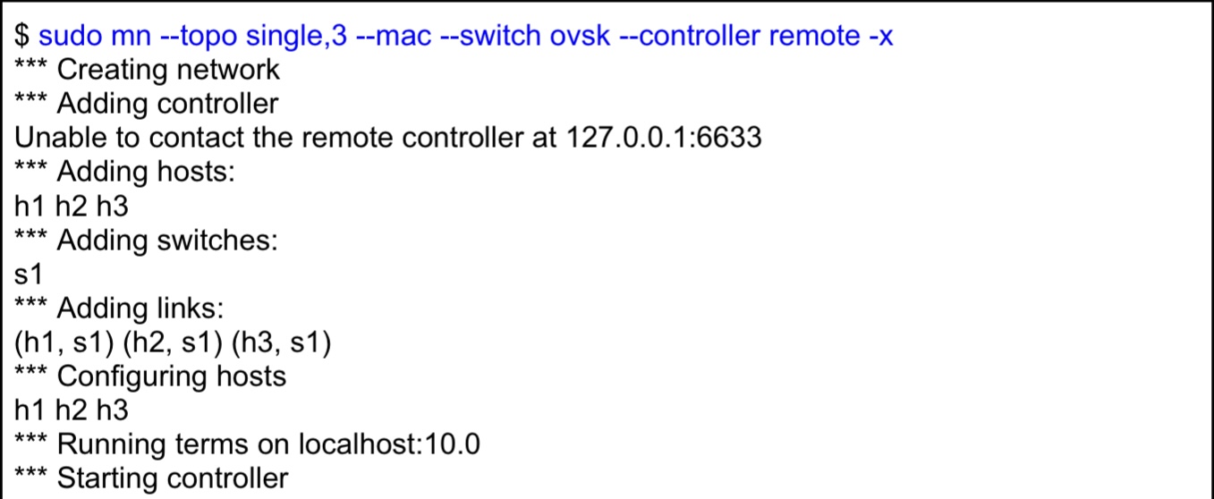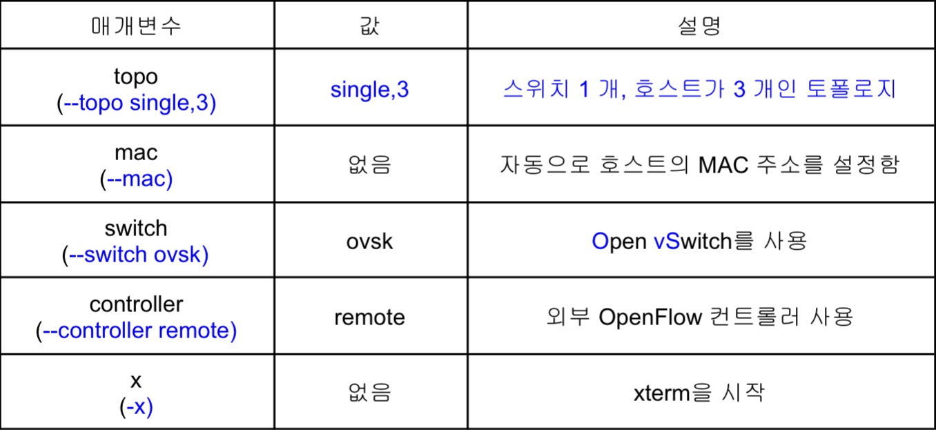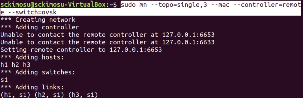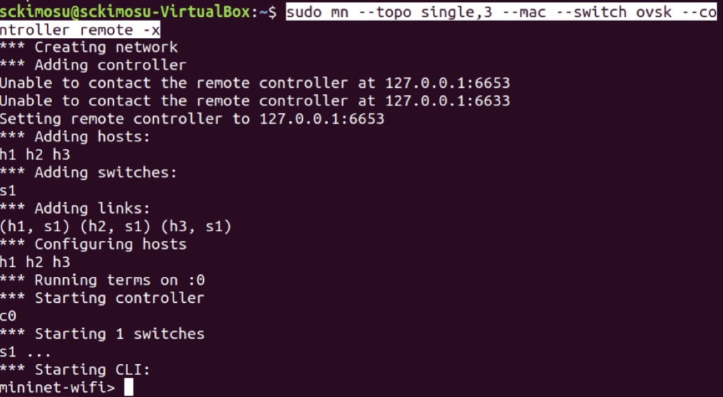 네트워크 생성함: sudo mn --topo=single,3 --mac --controller=remote --switch=ovsk