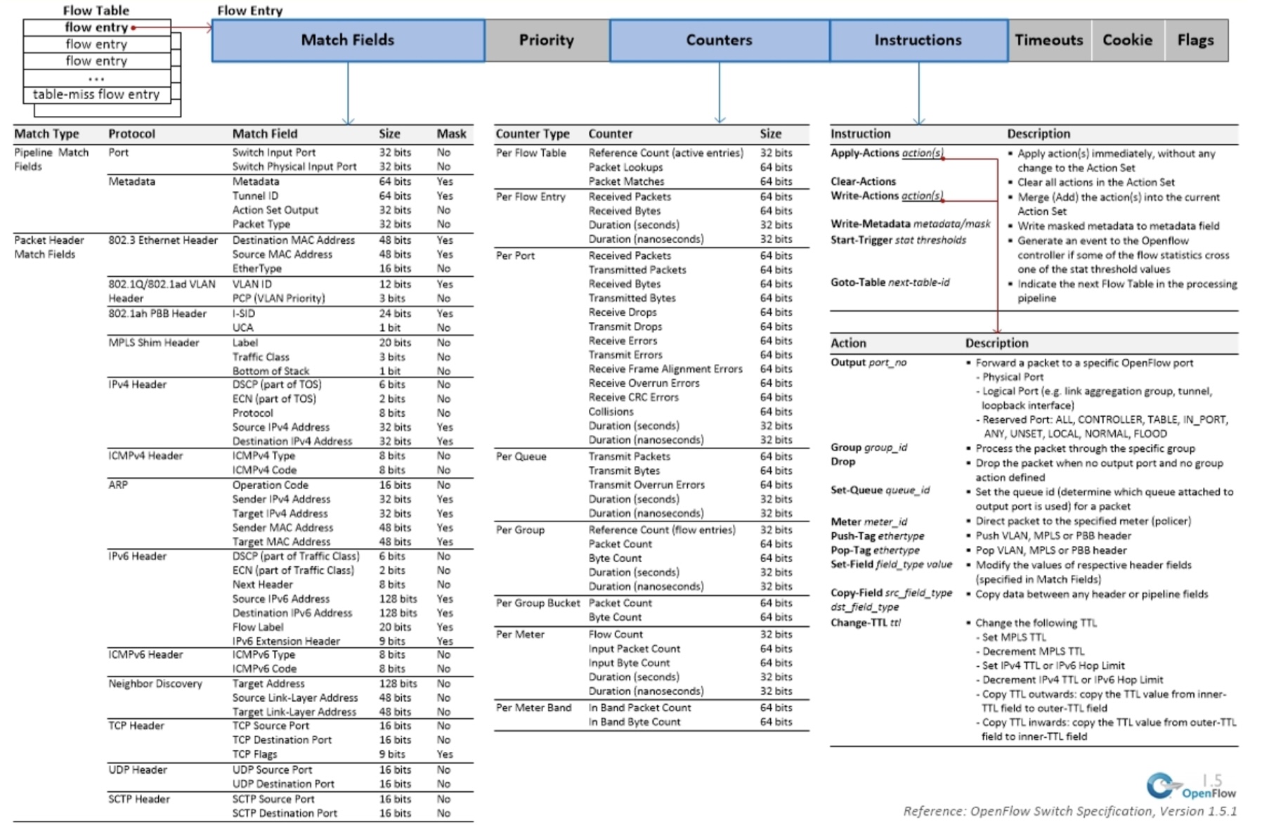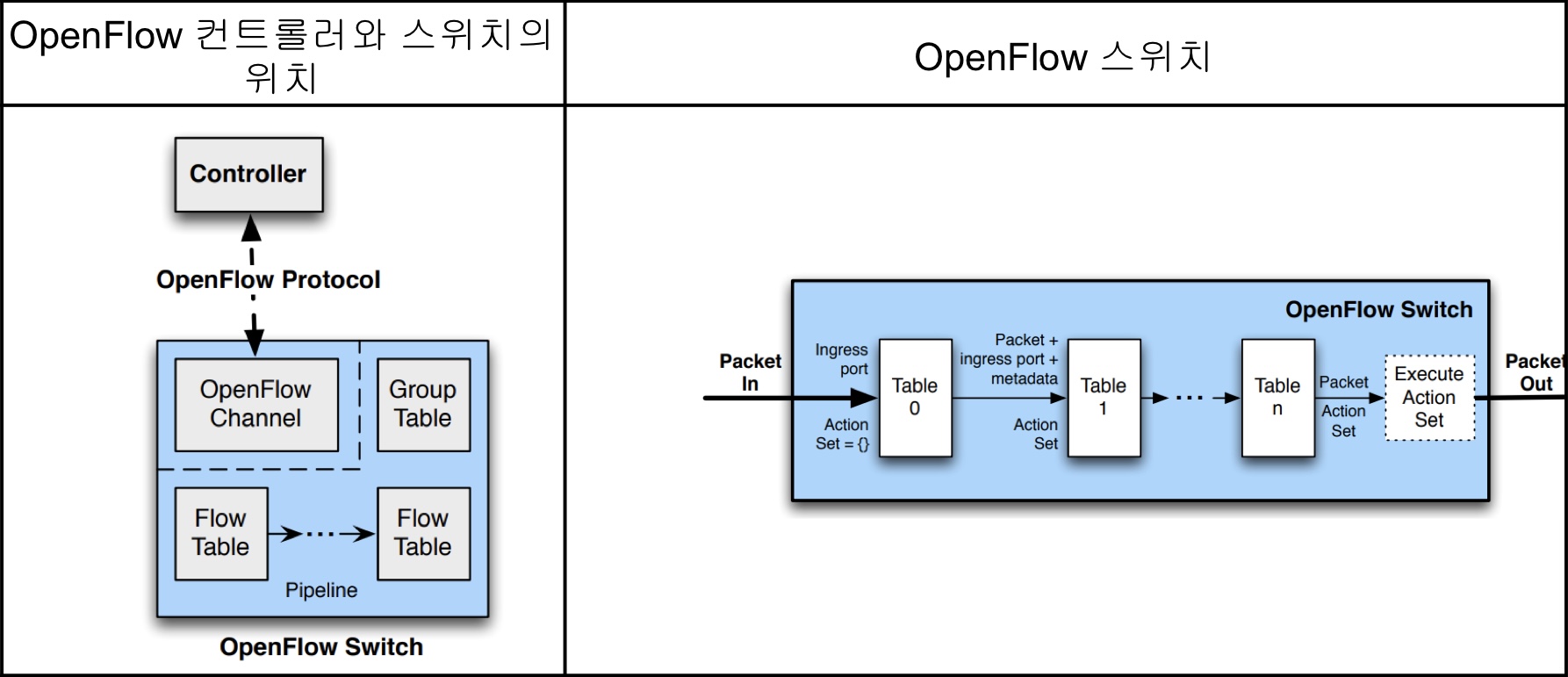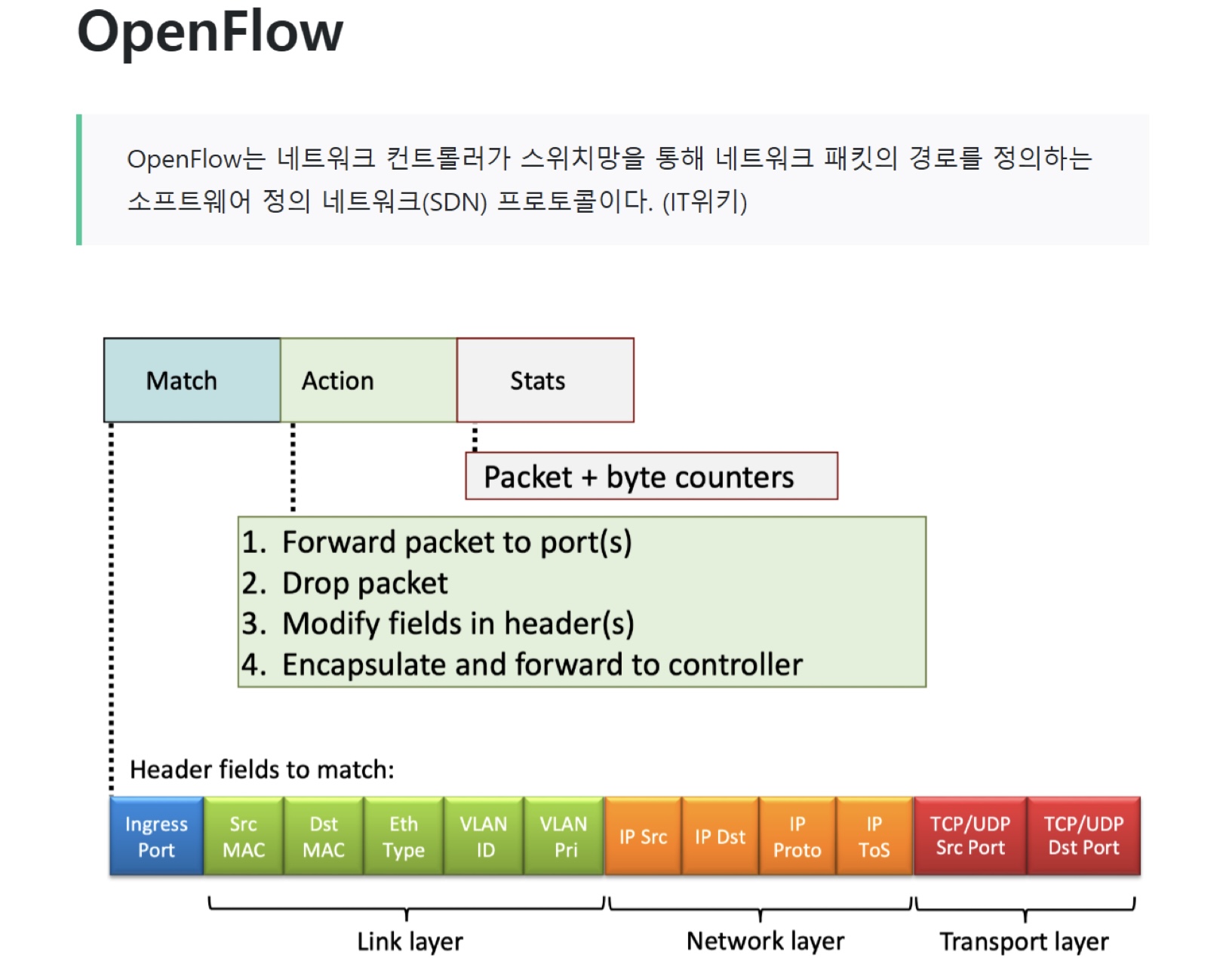 - OpenFlow 프로토콜은 OpenFlow 스위치와 컨트롤러가 통신을 위해 필요한 핸드 셰이크 등의 몇 가지 단계가 정의됨.