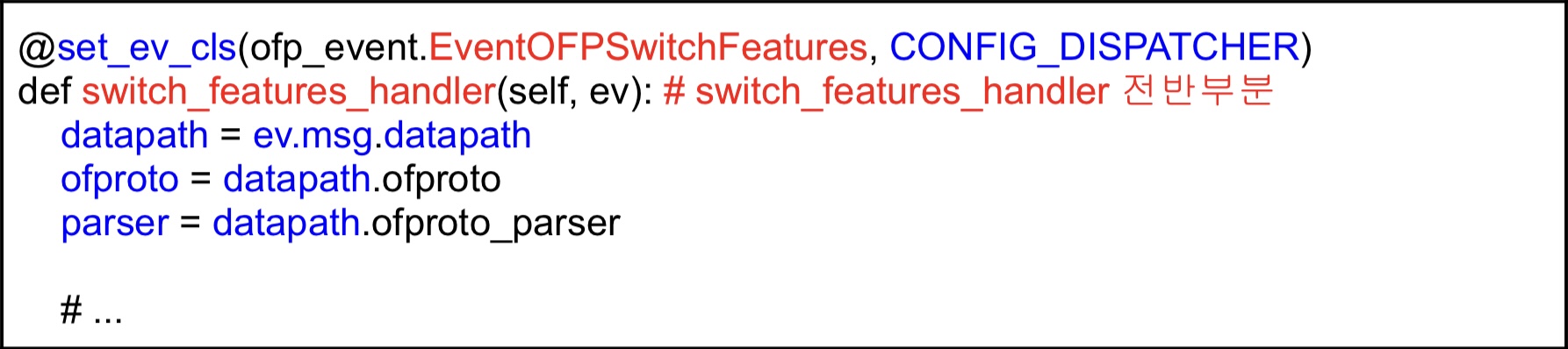 - switch_features_handler() 함수는 오류가 없으나, set_ev_cls 한정자의 전처리 함수가 있어야 제대로 동작한다.