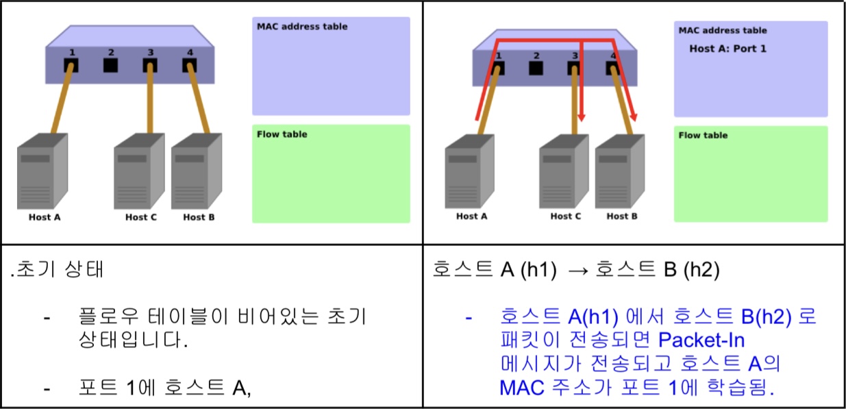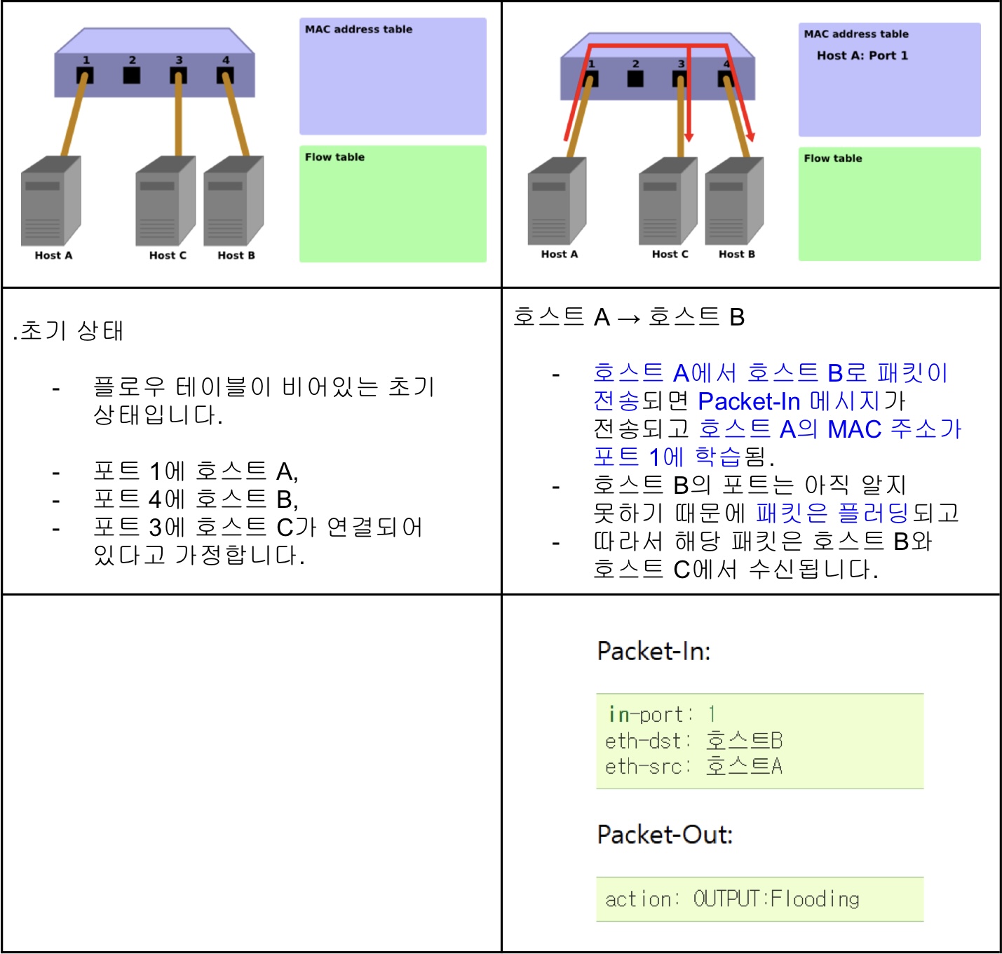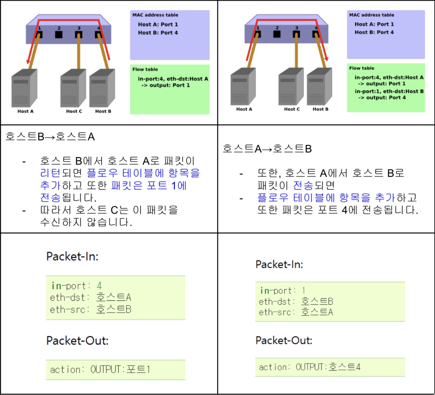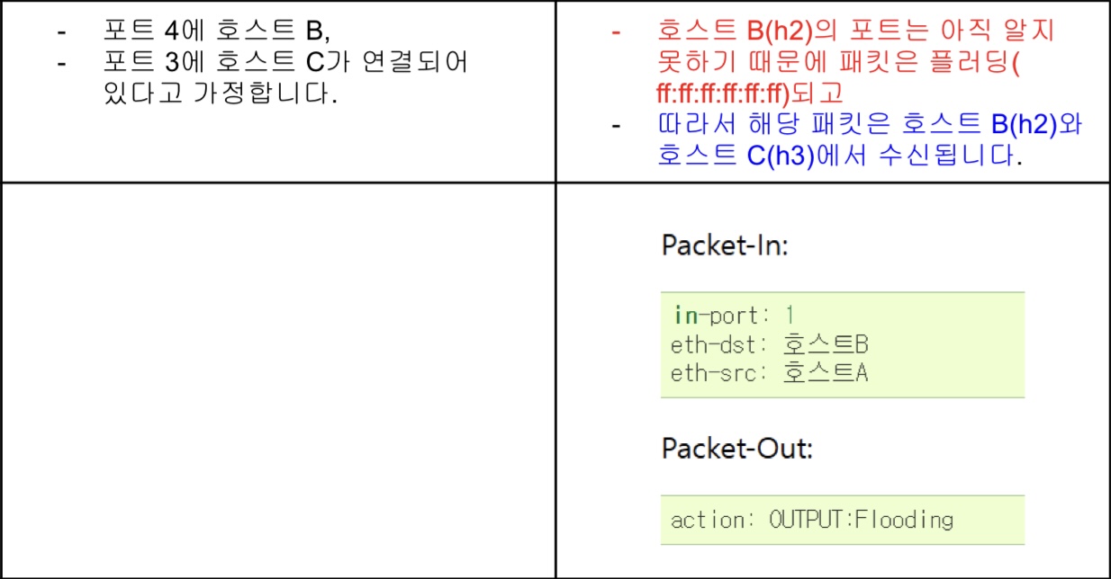- 알 수 없는 호스트인 경우 : Packet-Out 기능으로 패킷을 플러딩(Flooding: 패킷을 네트워크 상의 모든 연결된 장치로 보내는 방식)