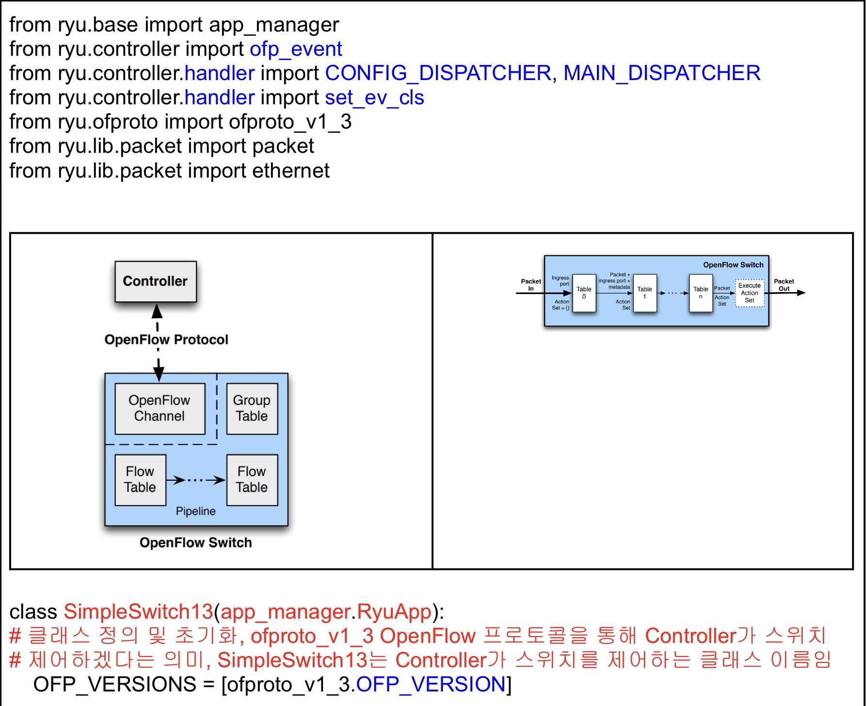 - 컨트롤러에 사용되는 클래스를 정의하고 초기화하며, ofproto_v1_3 OpenFlow 프로토콜을 통해 컨트롤러가 스위치하도록 한다