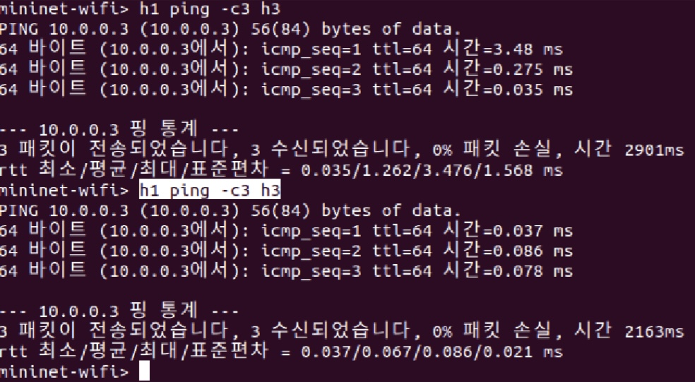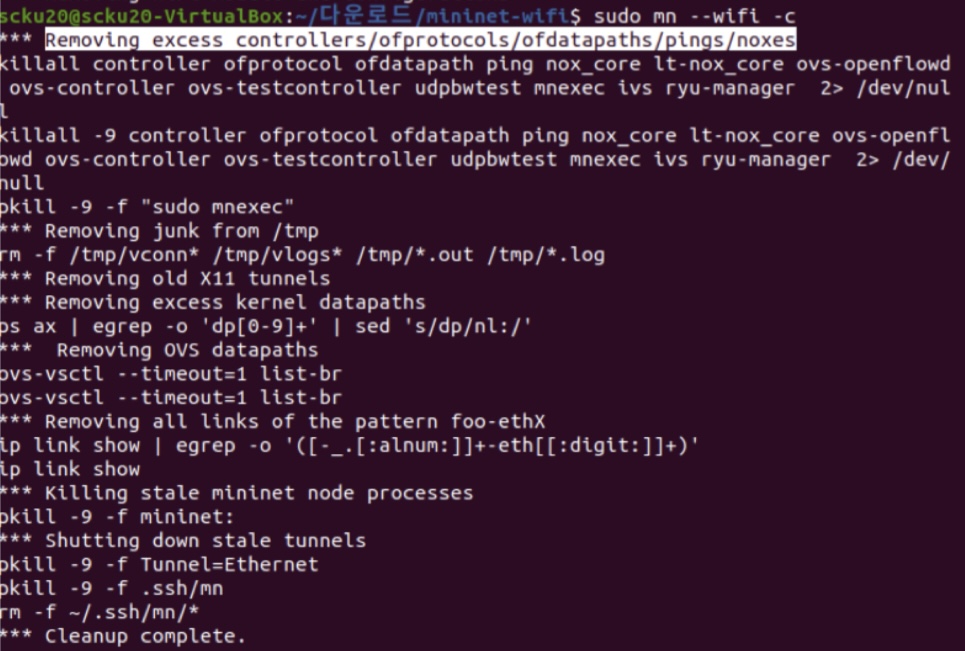 - 컨트롤러는 항상 sudo mn --wifi -c 로 clear를 해야 남아있는 이전 컨트롤러 리소스가 없음