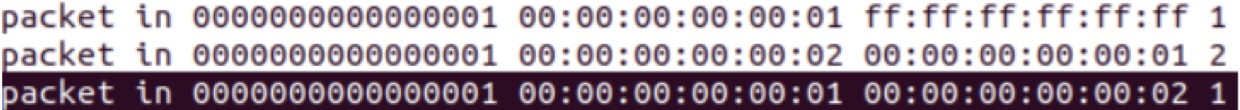 - 00:00:00:00:00:02 00:00:00:00:00:01 스위치 → 컨트롤러: 00:00:00:00:00:02 MAC 주소를 가진 h2가 ARP reply를 스위치로 보내면, 스위치는 ARP reply 메시지에 대한 Action을 할 수 없으니, packet in 메시지를 만들어서 컨트롤러에게 보냄