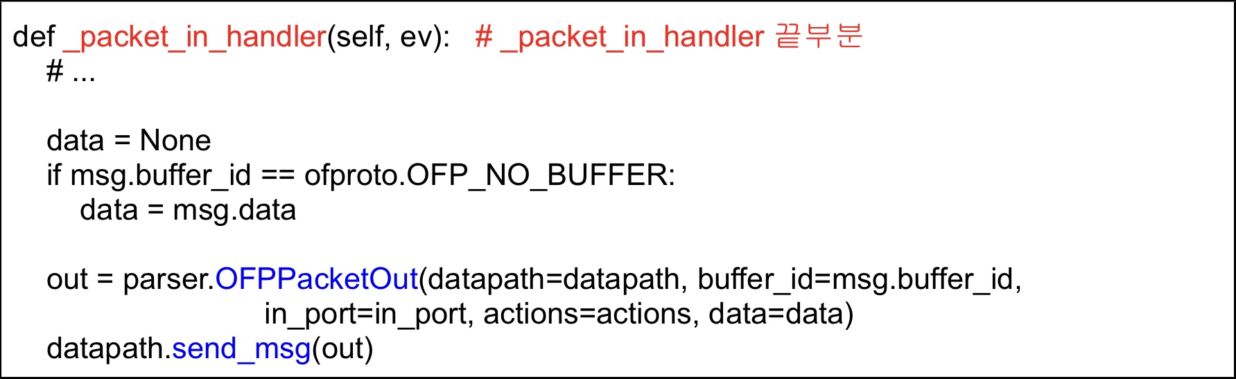 - 대상 MAC 주소를 MAC 주소 테이블에서 발견하는 여부와 관계없이 최종적으로 Packet-Out 메시지를 생성하여 수신 패킷을 전송합니다.