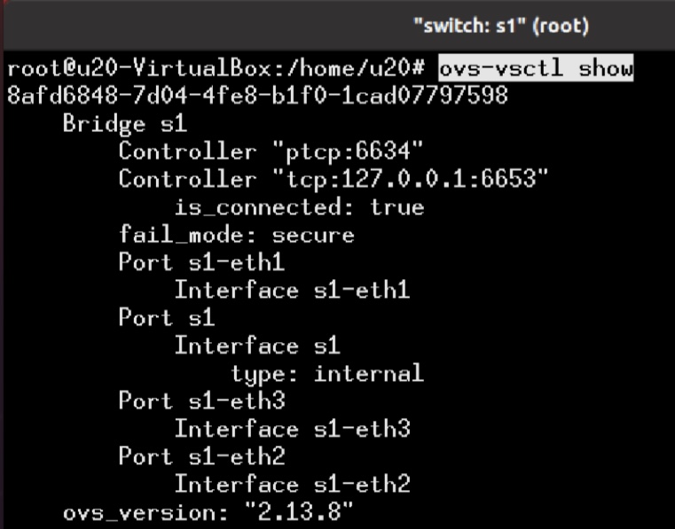 - 윈도우 제목이 「switch : s1 (root)」인 xterm으로 스위치용 xterm.