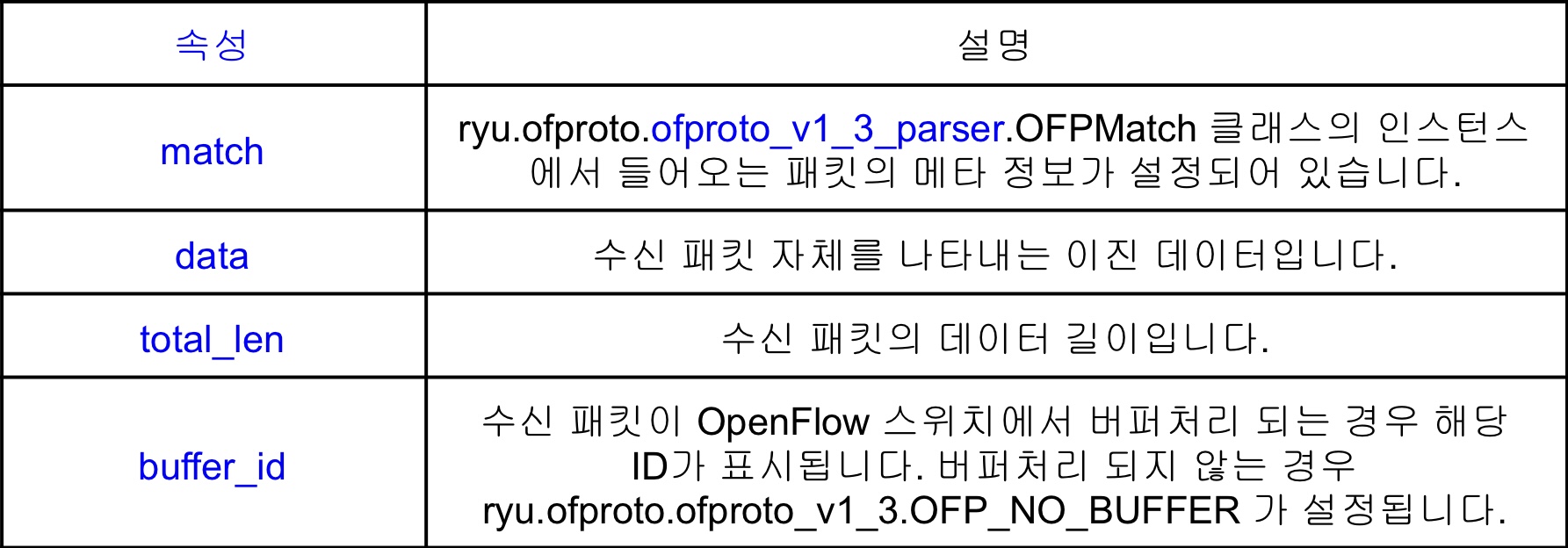 - 이벤트 클래스 이름은 ryu.controller.ofp_event.EventOFP + <OpenFlow 메시지 이름>임. 예를 들어, Packet-In 메시지의 경우 EventOFPPacketIn 입니다.
