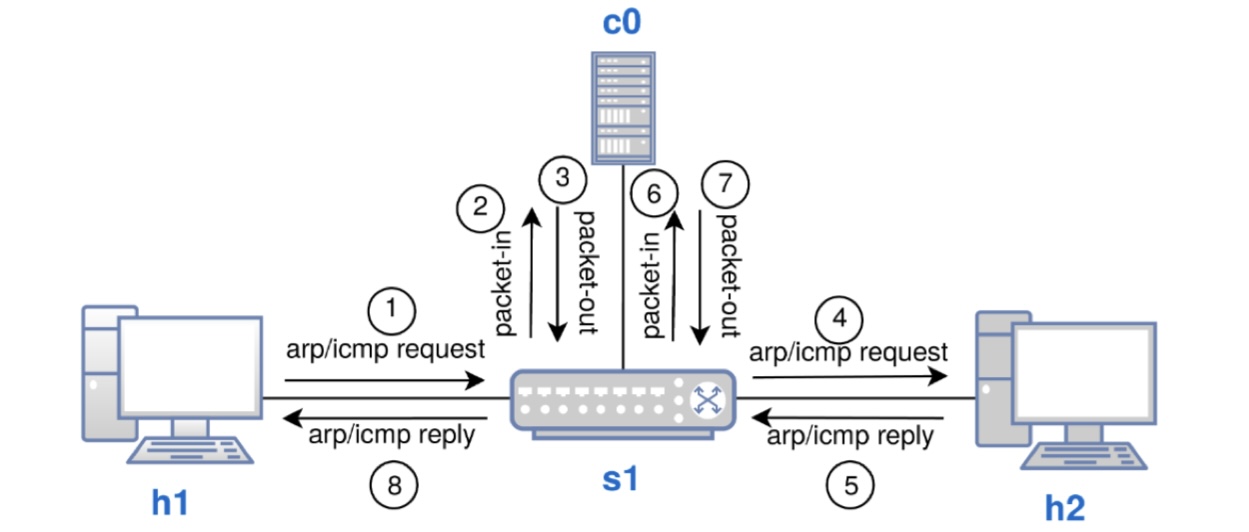 - Open Switch s1은 h2의 존재를 알지 못하고, Ping Request 메시지를 Open Controller c0에 전달합니다.