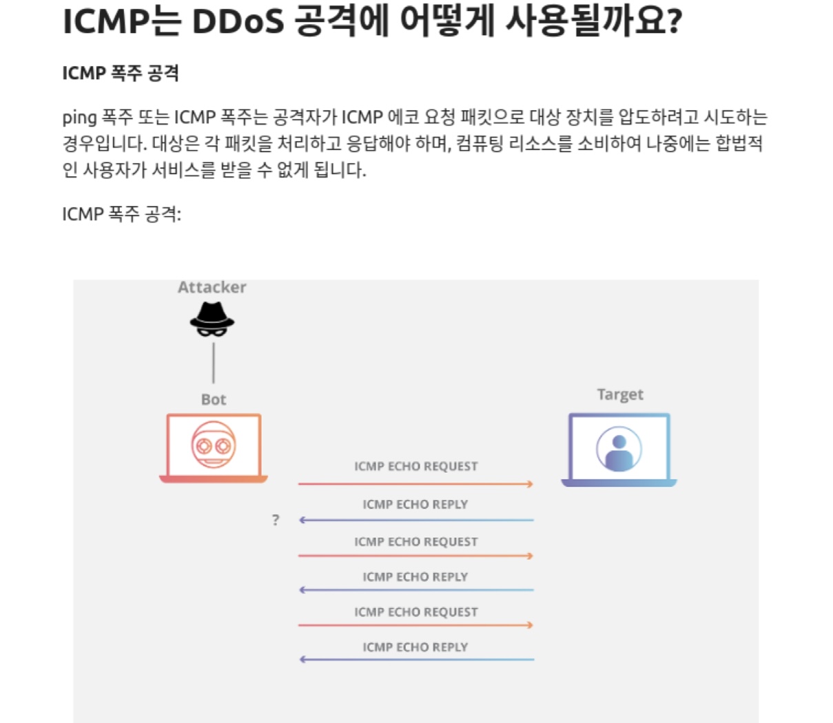 - ping 폭주 또는 ICMP 폭주는 공격자가 ICMP 에코 요청 패킷으로 대상 장치를 압도하려고 시도하는 경우 발생