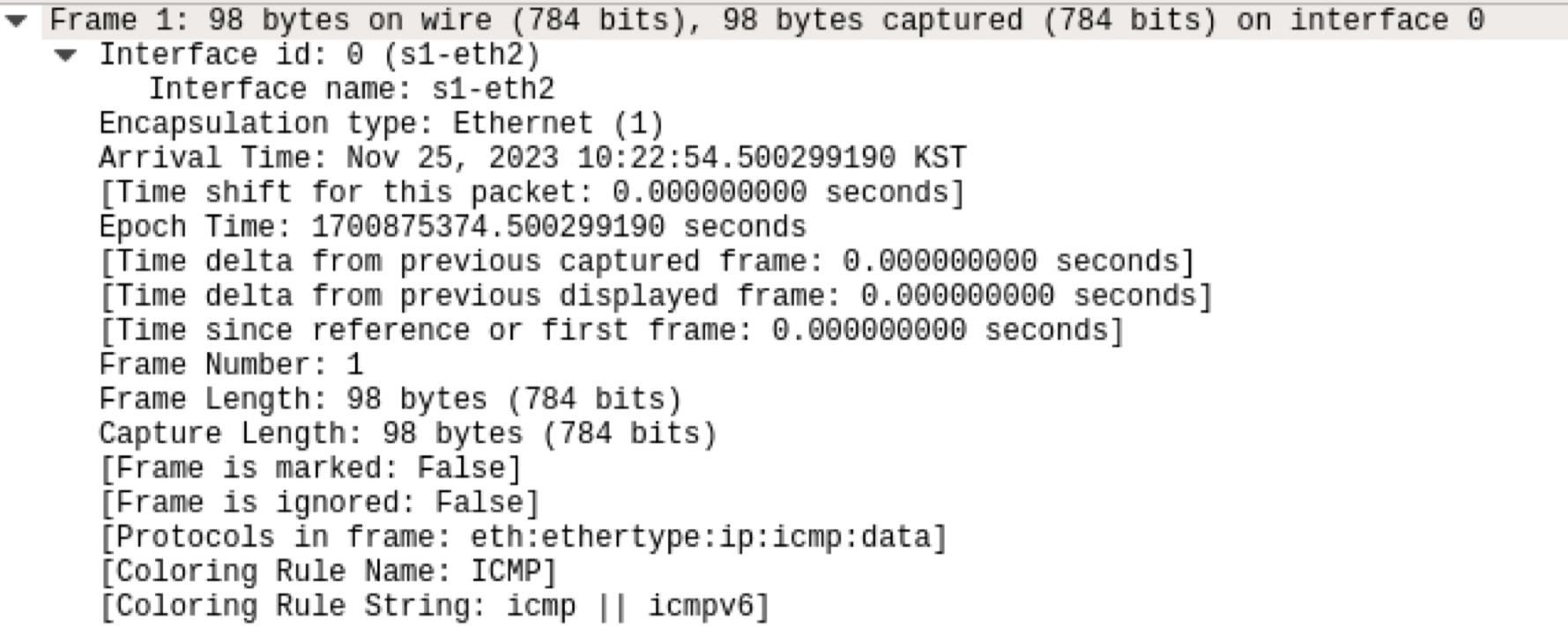 6. Wireshark에서 s1-eth1 인터페이스를 선택한 후, h1과 h2 간 Ping 통신의 두 번째 패킷을 캡처하여 RTT(Round Trip Time)를 계산하는 방법을 기술하시오.