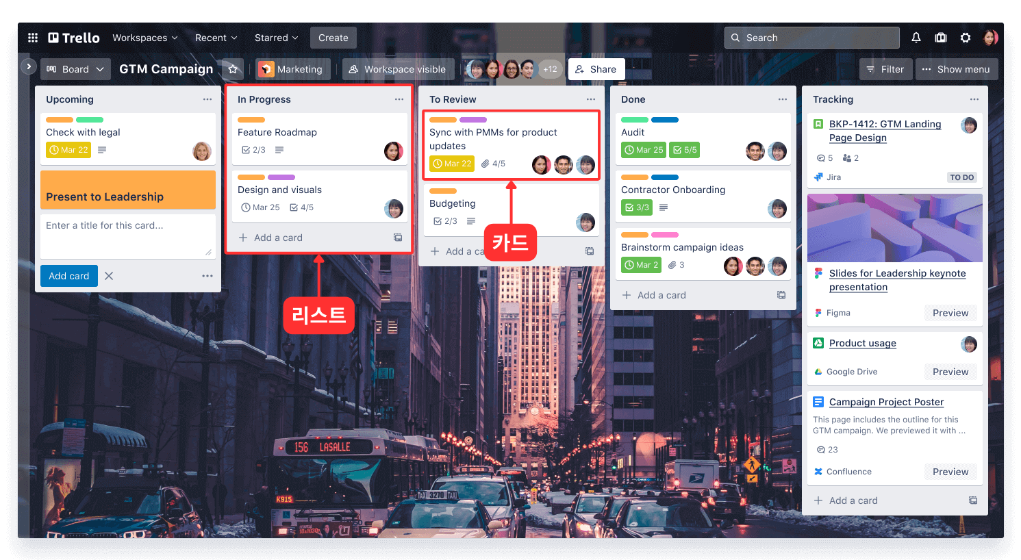 Trello에서는 여러 개의 리스트를 만들고, 삭제할 수 있으며 존재하는 리스트들은 드래그&드랍을 통해 순서를 변경할 수 있습니다.