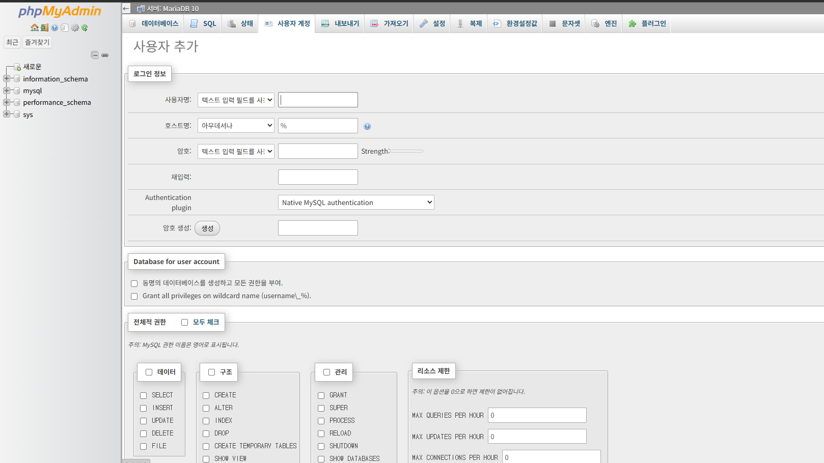 로그인은 계정명 root에 MariaDB10을 설치할 때 쓴 패스워드를 쓰면 된다.
