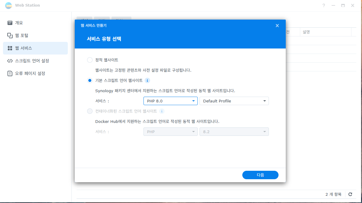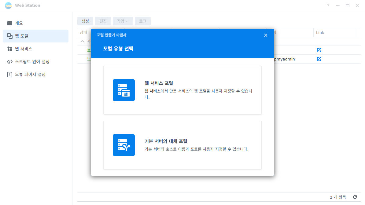 이제 web station 으로 와서 생성 버튼을 누르면 저렇게 뜬다.