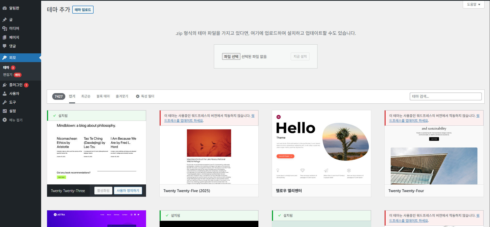 왼쪽에 외모 누르고 테마 추가 누르면 테마를 업로드도 할 수 있다.
