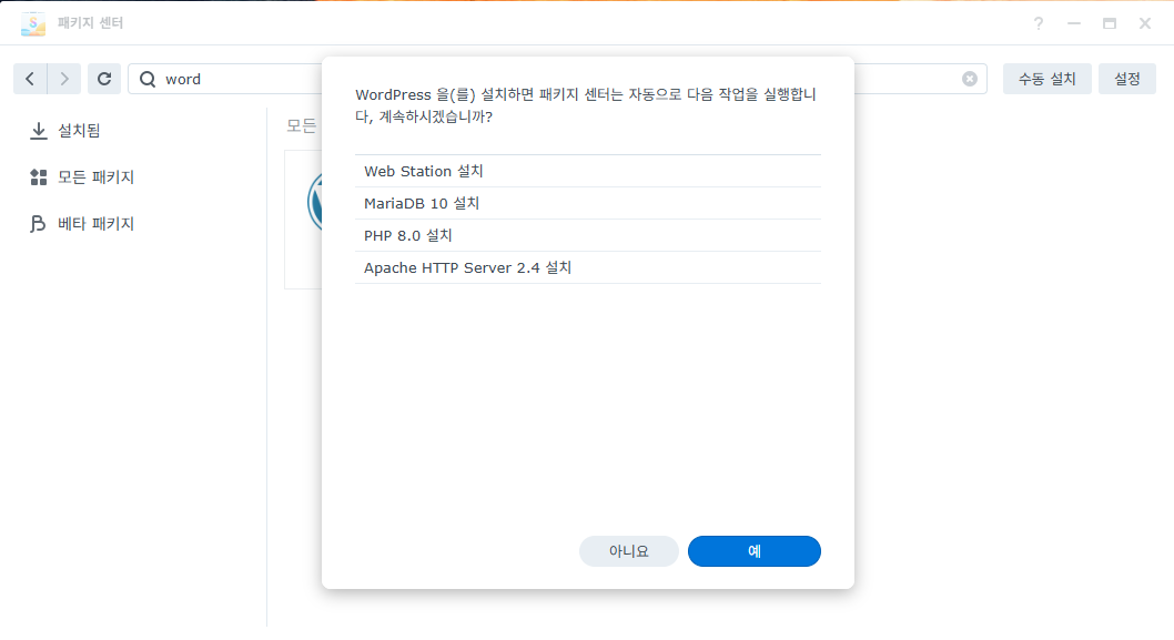 • 패키지 센터에서 위 4가지 패키지를 각각 “설치” 버튼만 눌러 순차적으로 설치하세요.