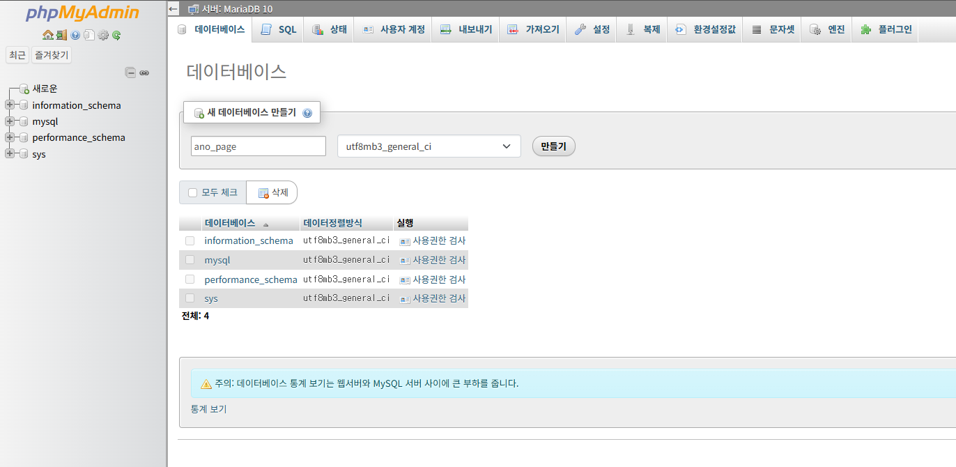 이번엔 데이터베이스에 들어가서 압축을 푼 이름과 똑같이 데이터 베이스를 만들어줬다.