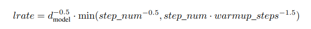 (warmup_step(<=4000)인 초반에는 learning rate가 선형적으로 증가하다가, 그 이후에는 스텝수의 power of -0.5(제곱근의 역수)에 비례하게 감소한다.)