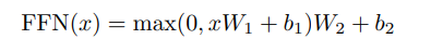 - 두 개의 linear transformation에 ReLU 활성화 함수를 적용하여 다음과 같은 수식으로 표현된다.