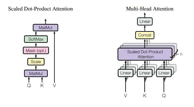 - Right is Multi-head Attention (head means one scaled dot-product attention)