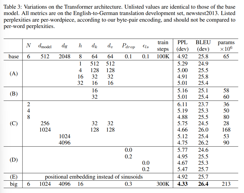 (A)의 경우 cost가 동일한 상황에서 attention head의 개수와 attention key/value 차원에 변화를 주었고, (B)의 경우 attention key size가 크면 좋다는 것을 볼 수 있다. (c)의 경우 모델이 클수록 좋다는 것을 보여주고, (d)의 경우 dropout이 과적합을 방지해 좋다는 것을 보여준다. 마지막으로 (e)의 경우 positional embedding을 sinusoid을 바꾸었는데, 거의 비슷한 결과를 보여주었다.