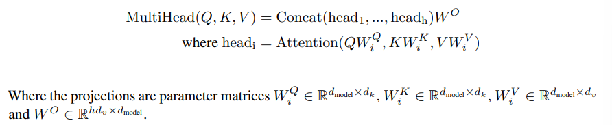 - h는 하이퍼파라미터로, head(self-attention)의 개수이고, 본 논문에서는 8을 사용하였다. d_k와 d_v에 8을 곱하면 d_model이 되므로 total computational cost를 맞추기 위해 8을 사용하였다고 한다.