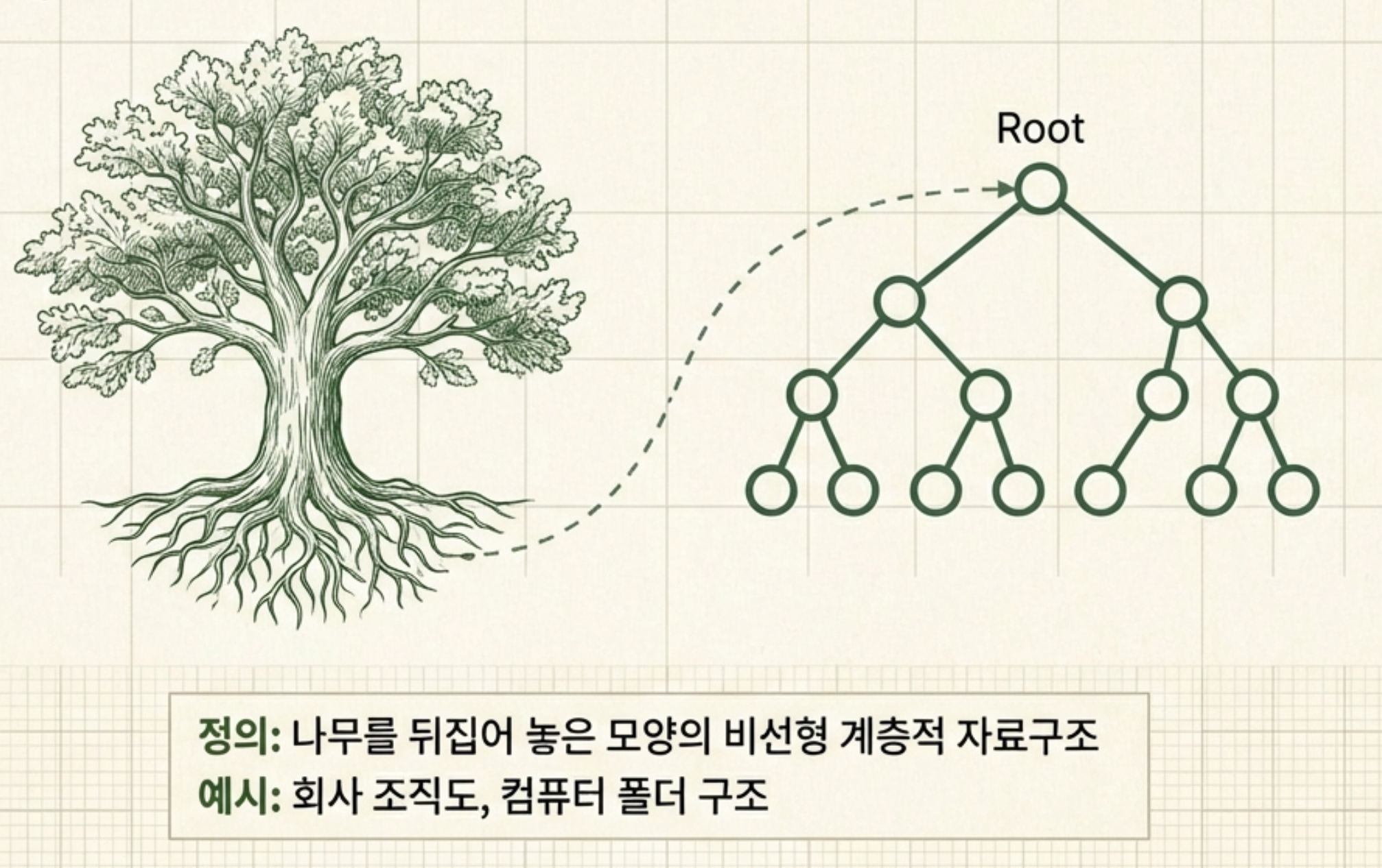 자료구조에서는 트리를 뒤집어서, 루트가 위에 있고 아래로 뻗어나가는 형태이다.