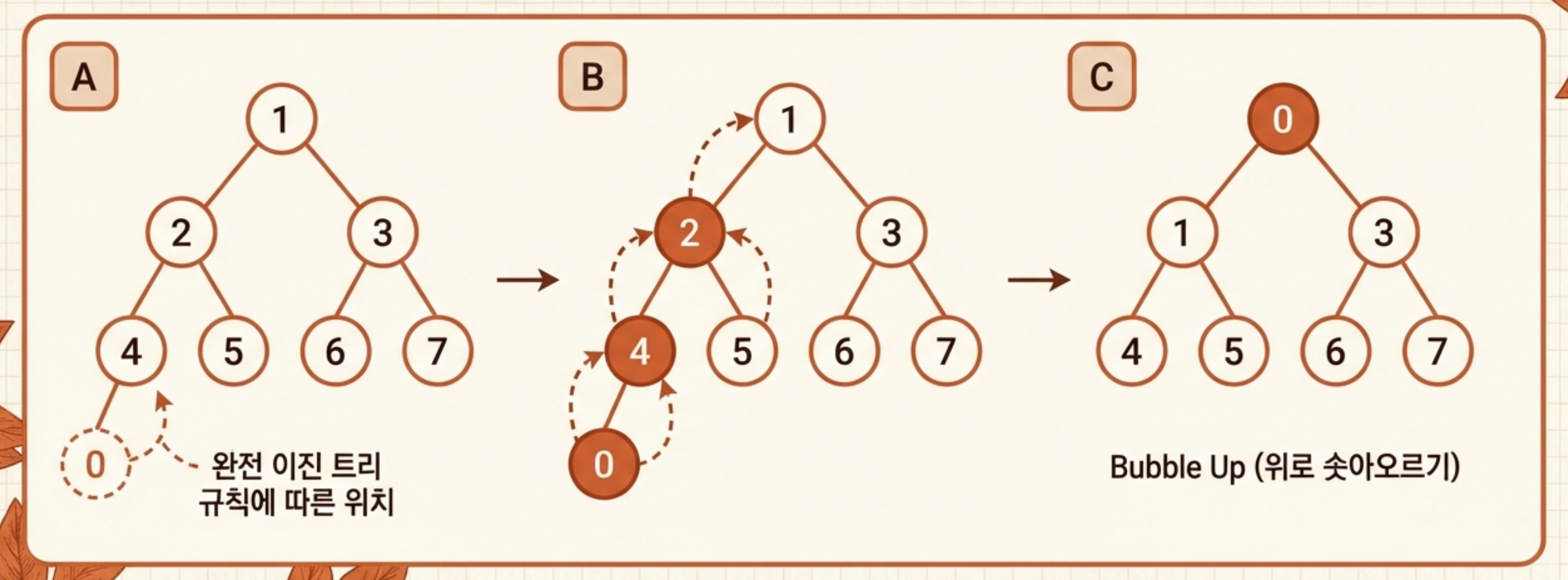 결국 C와 같은 형태로 최소 힙의 INSERT가 마무리가 된다.