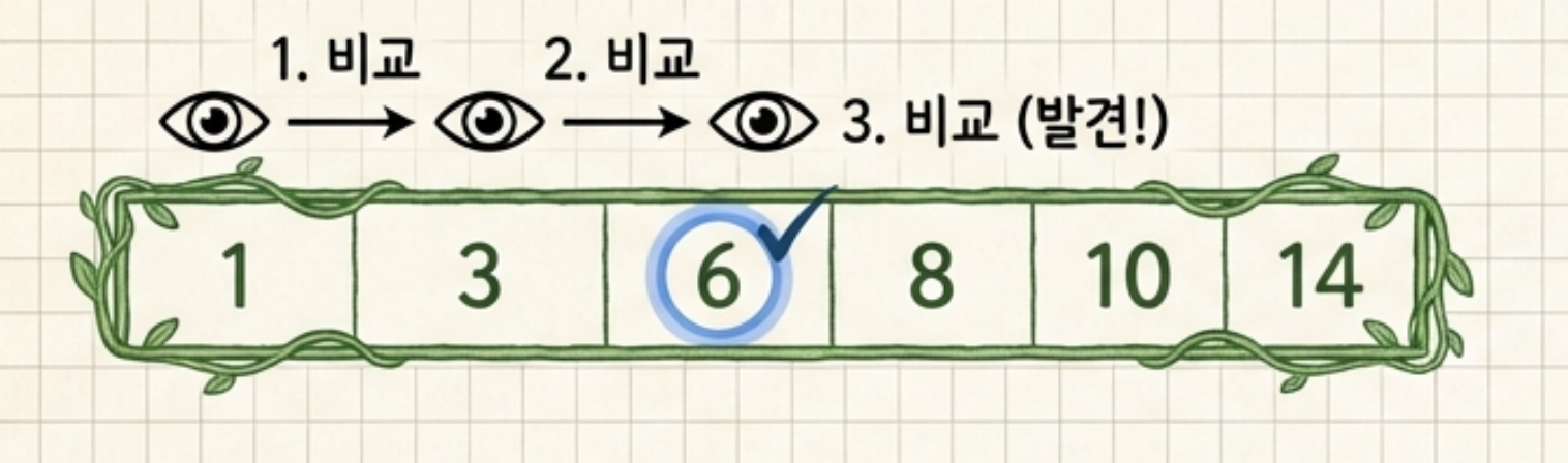 일반 배열에서 선형탐색 방식으로 '6'이란 값을 찾아보자.