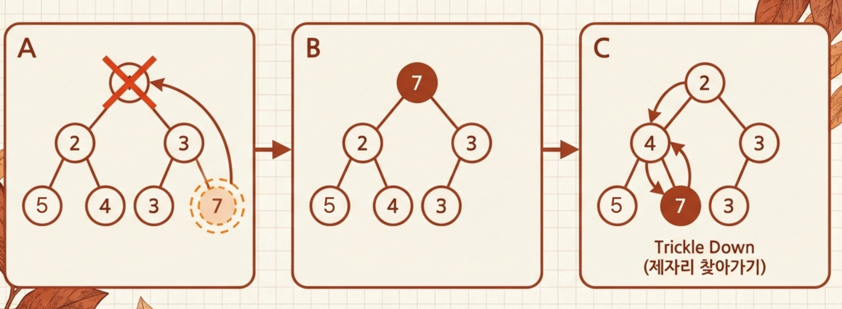 이렇게 하나씩 값을 비교하면서 자리를 찾아가는 방식을 Trickle Down 이라고 칭한다.