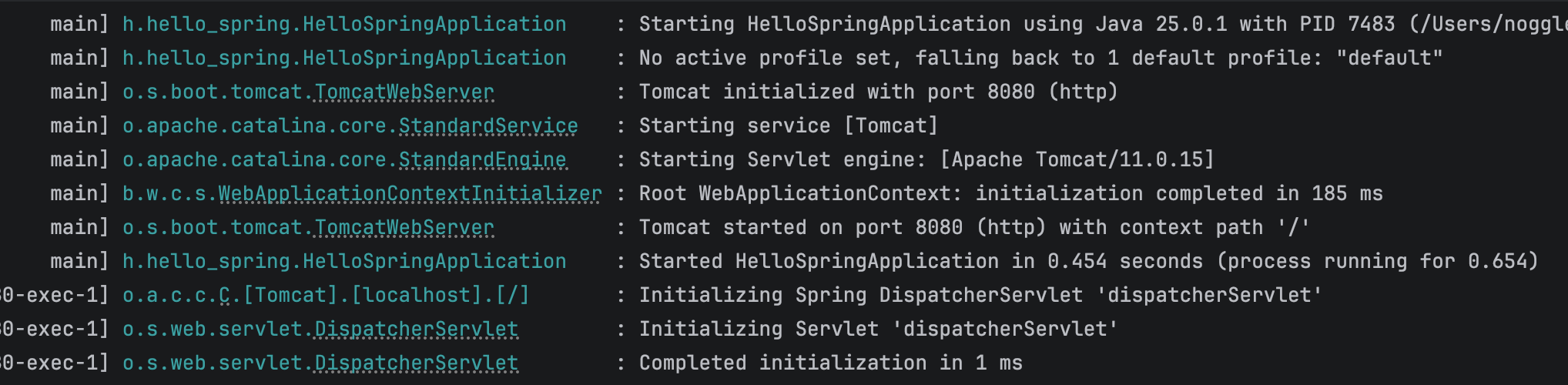 이 과정에서 Tomcat은 기본 포트(8080)에 자동으로 바인딩 되며, Tomcat 관련 로그를 터미널에서 확인할 수 있다.
