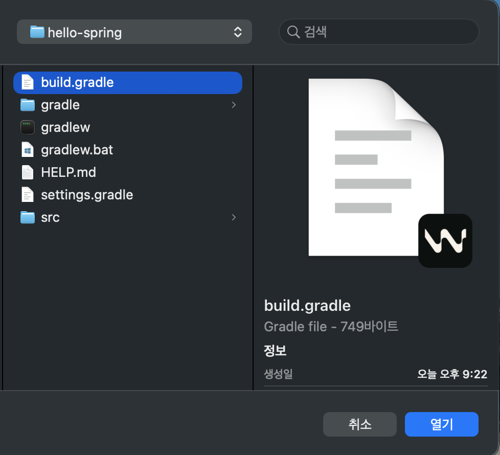 개발용 폴더에서 압출 풀기 | IntelliJ에서 build.gradle 열기 |