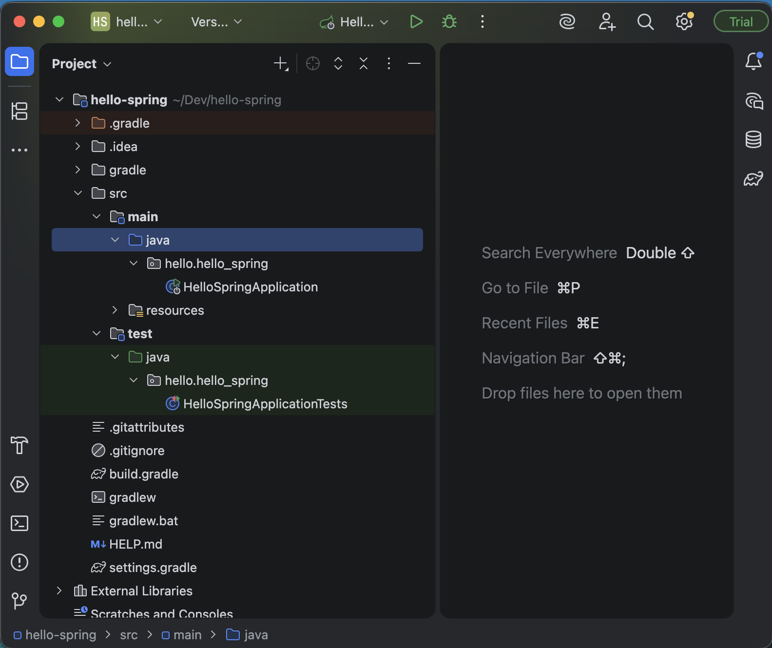 java 폴더 내부에는 HelloSpringApplication 클래스가 있으며, 이 클래스에는 main 메서드가 존재한다.