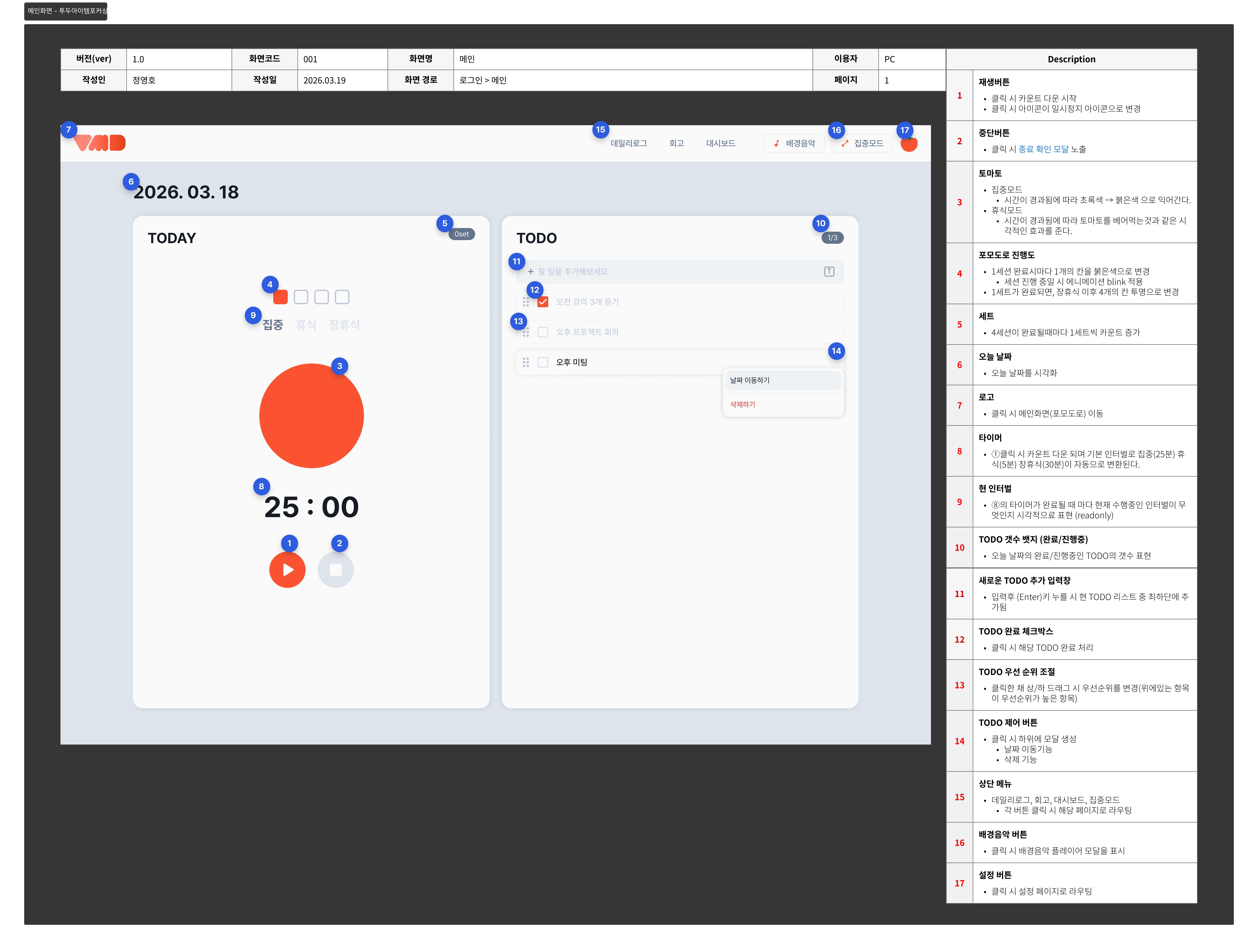 각자 하나의 기능을 맡아 아래 내용을 중심으로 와이어프레임을 작성하기로 했다.