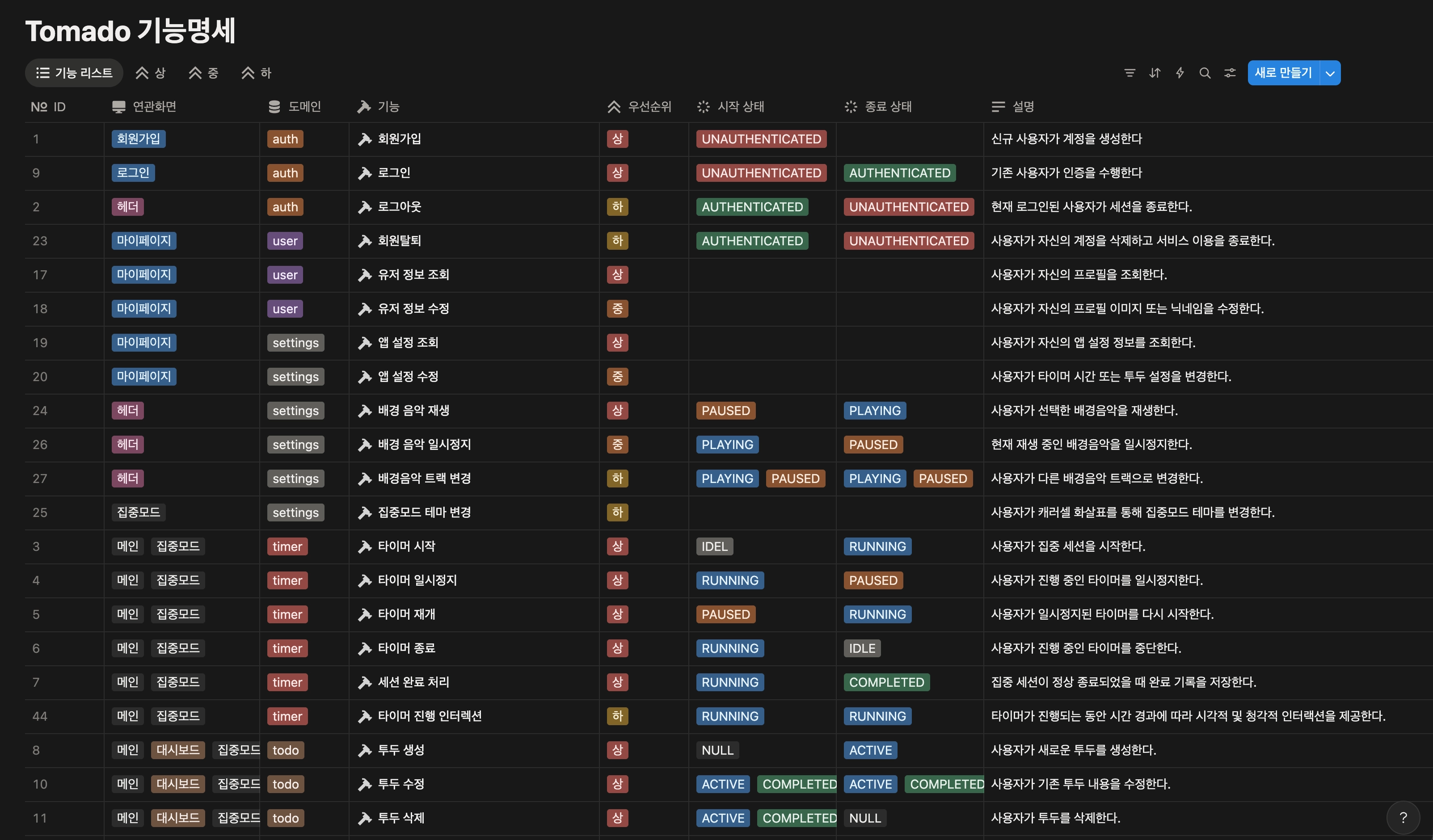그래서 이번에는 기능 명세 단계에서부터 상태값을 함께 정리했다.
