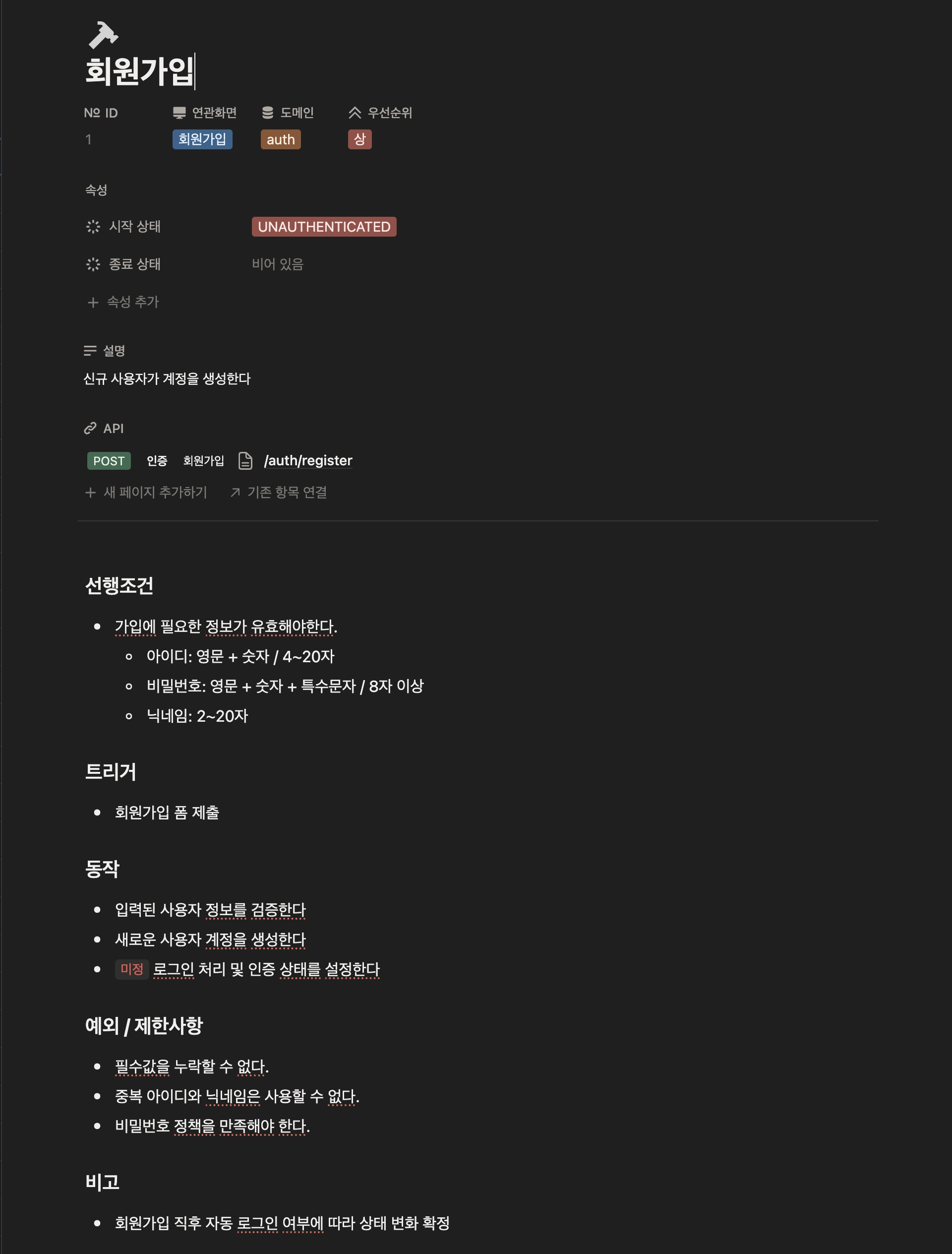 본문 요소는 선행조건 트리거 동작 예외/제한사항 으로 구성했다.
