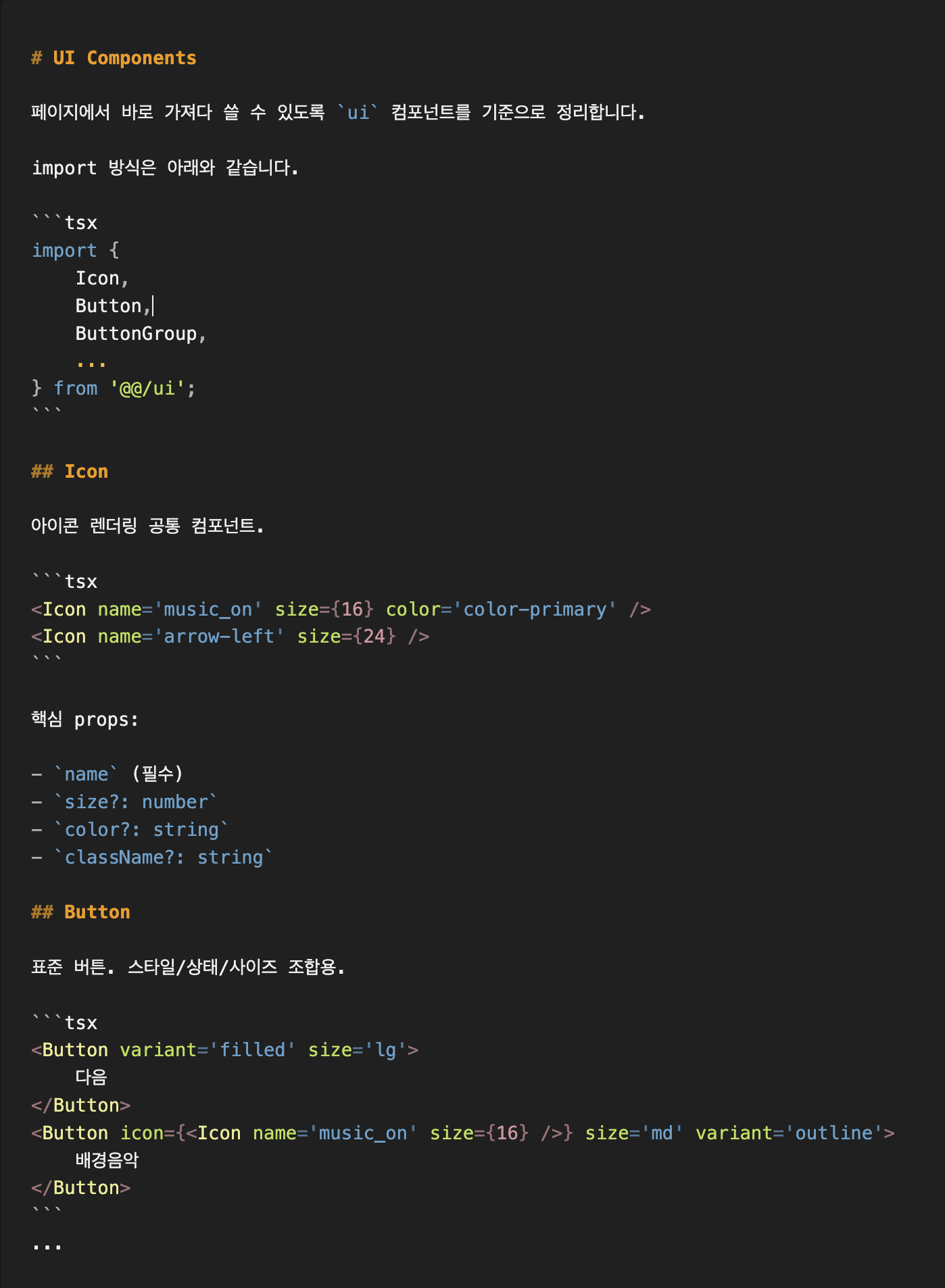컴포넌트 문서의 경우 실제 코드에서 바로 가져다 쓸 수 있도록