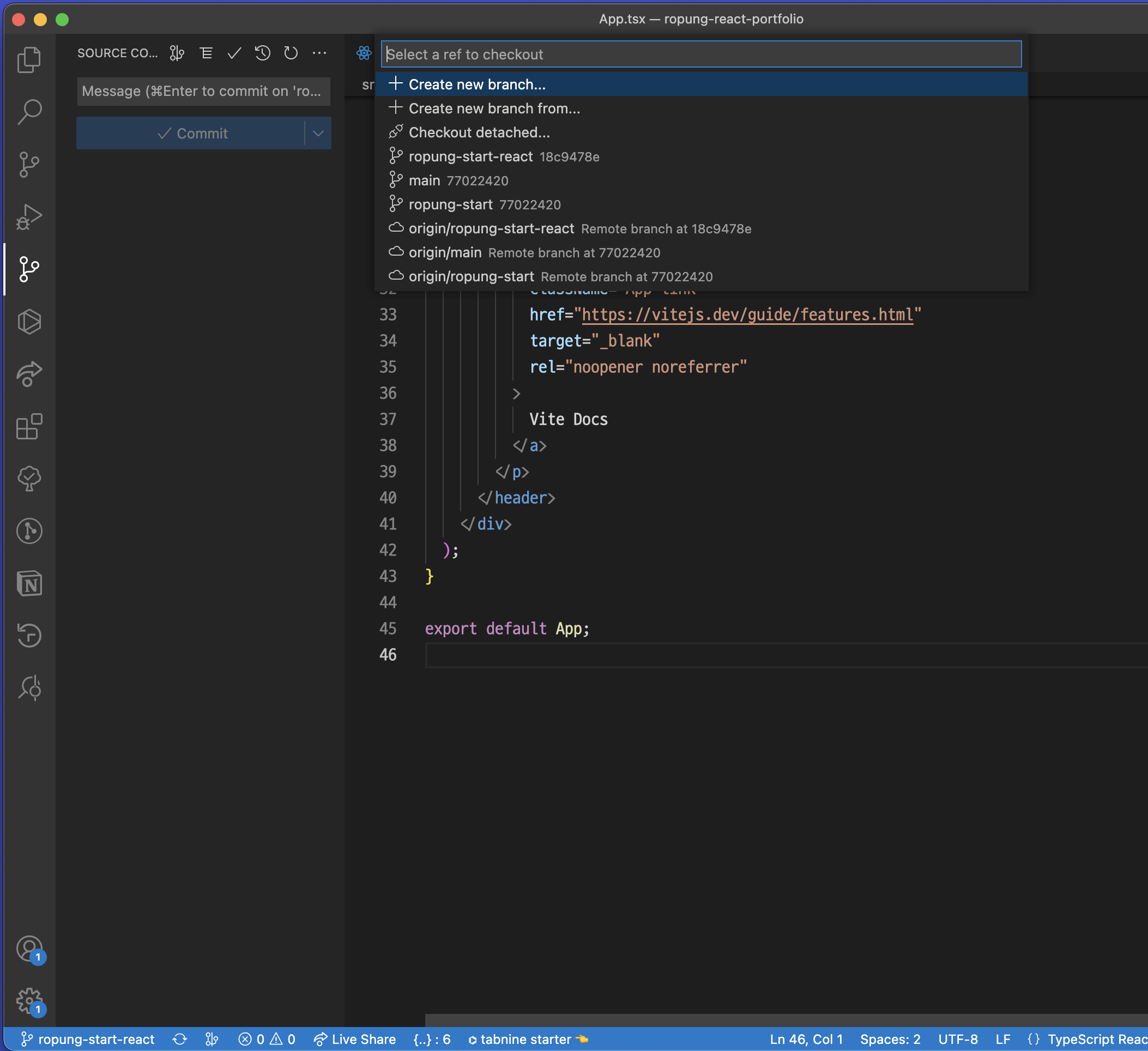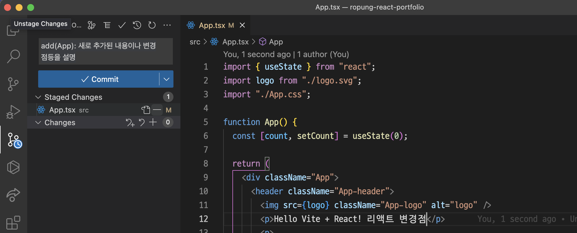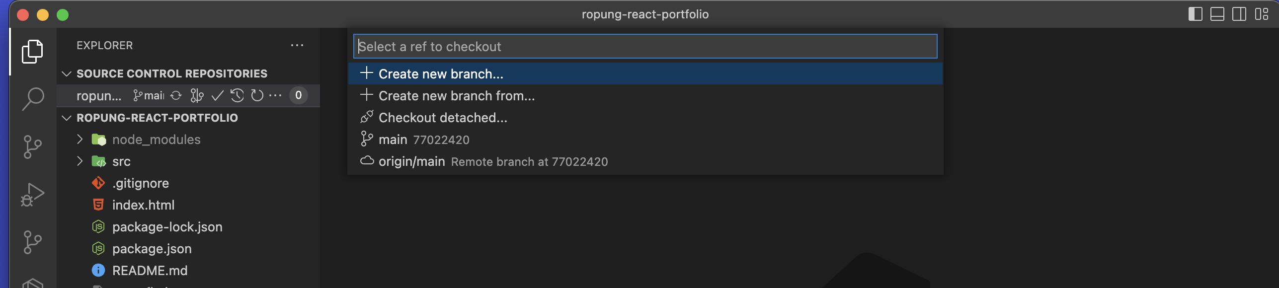 ropung-react-portfolio 이라는 폴더에서 터미널 경로를 확인하고
