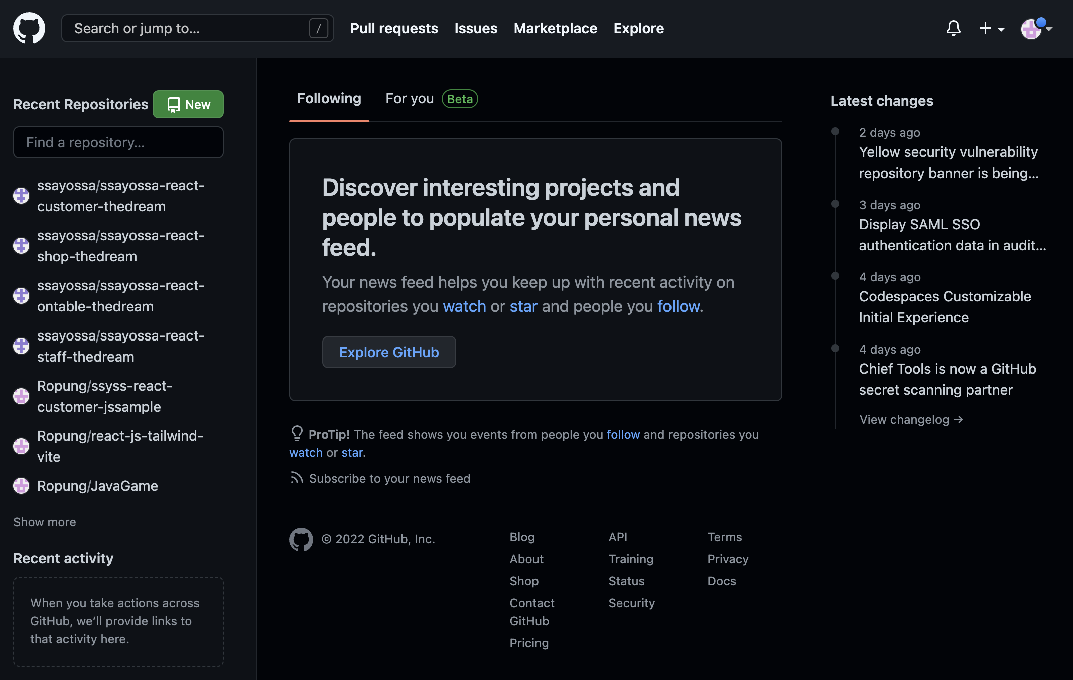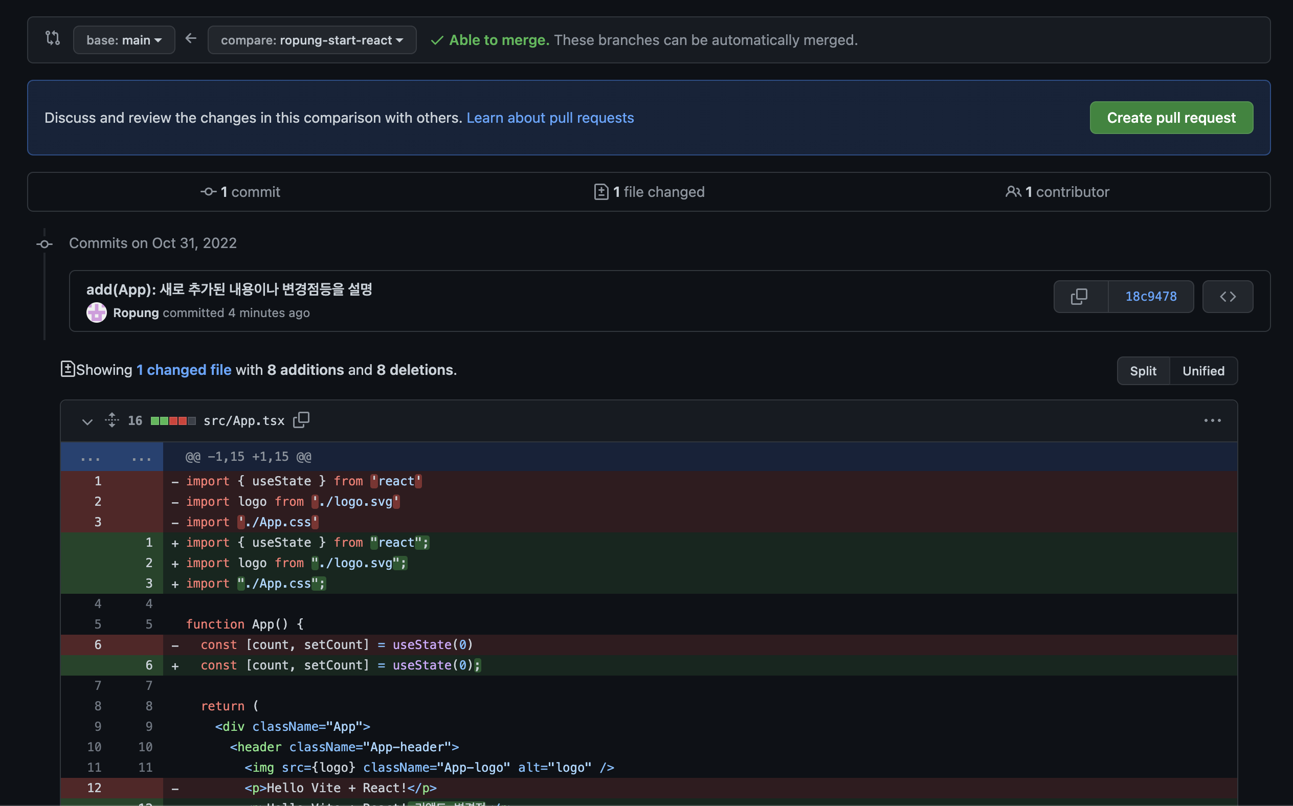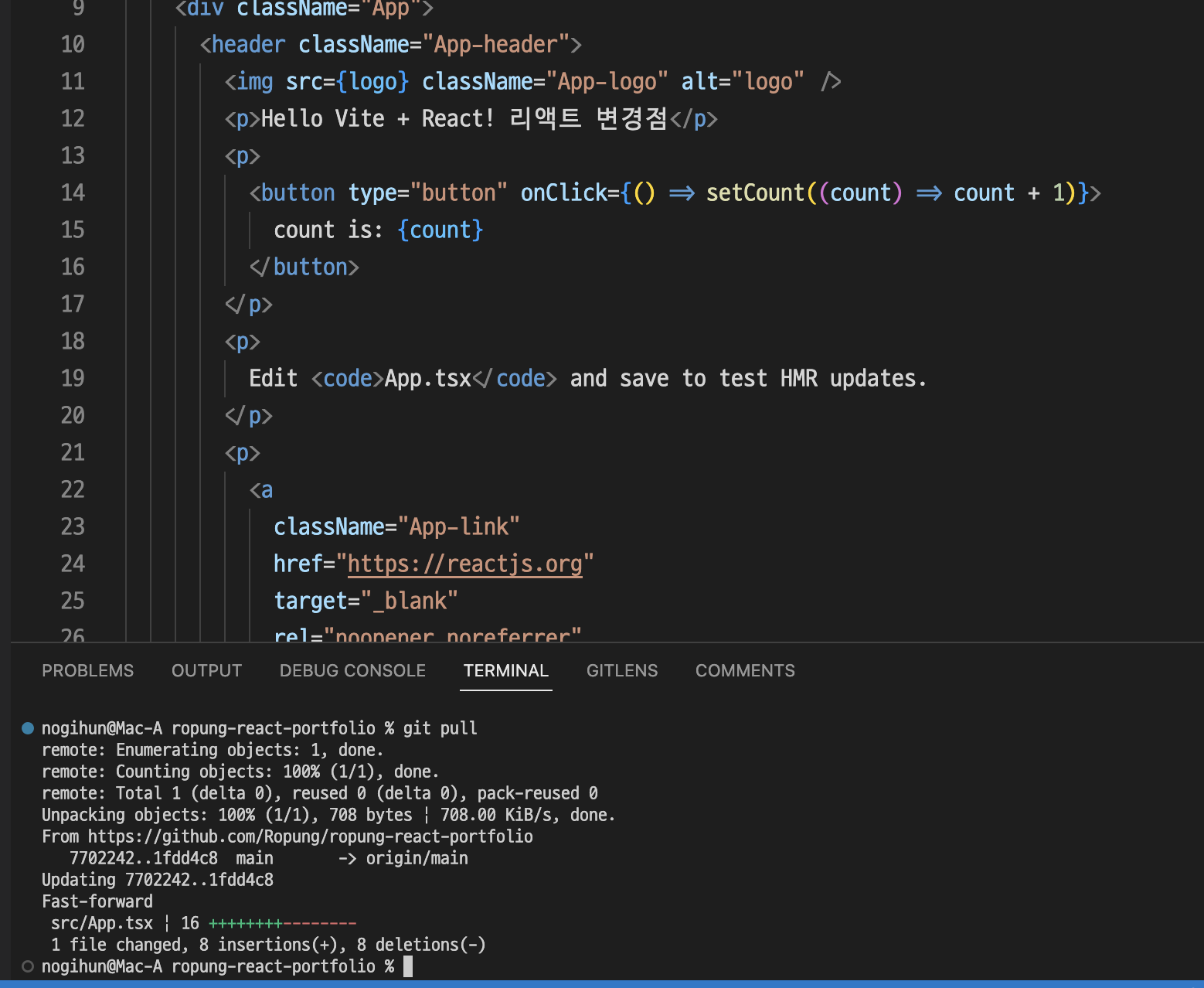 바뀐 내역을 터미널로도 확인할수있고 실제로 리액트 변경점이라는 문구가 새로생긴것을 확인할수있다.